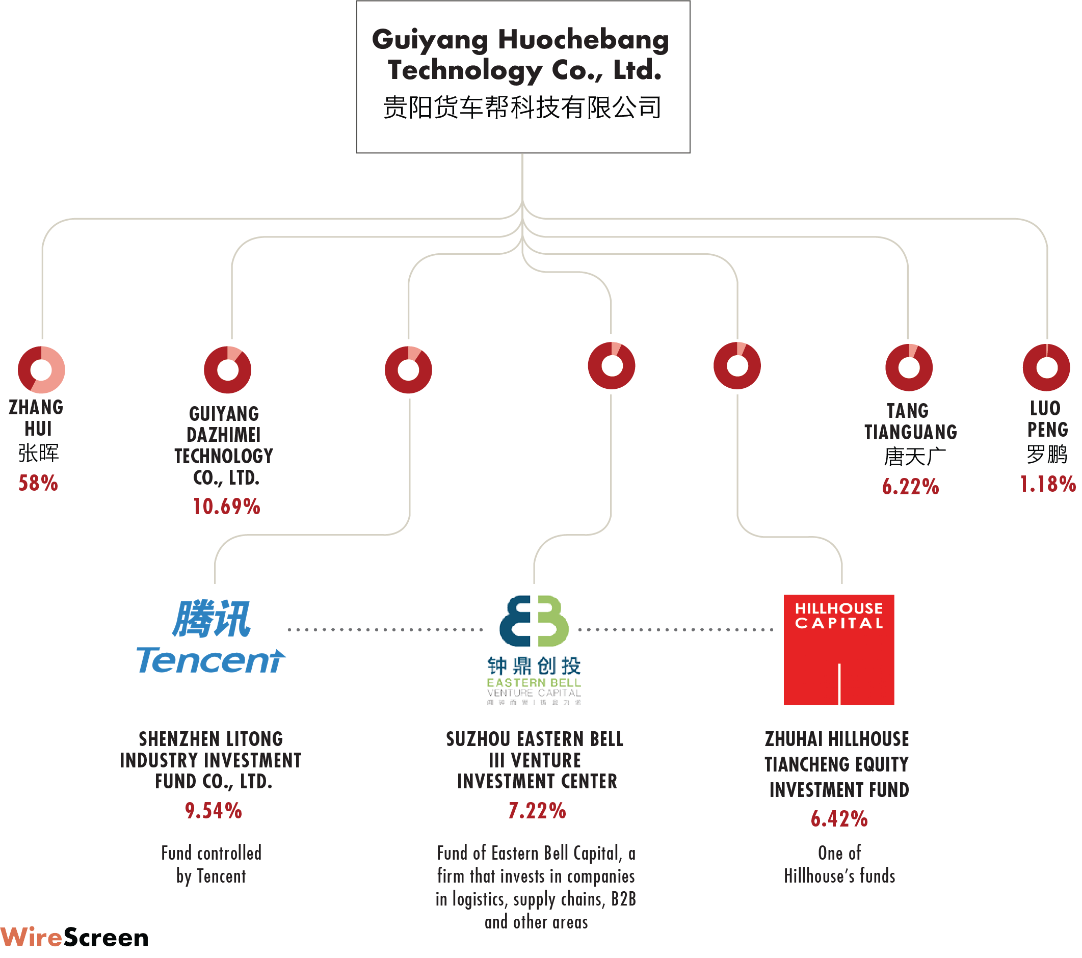 Below, using data from our WireScreen platform, we show shareholder records that detail who owns Guiyang Huochebang3This company was randomly selected to show an example of what a corporate shareholding structure looks like. It is not one of Hillhouse’s larger deals alongside Hillhouse.