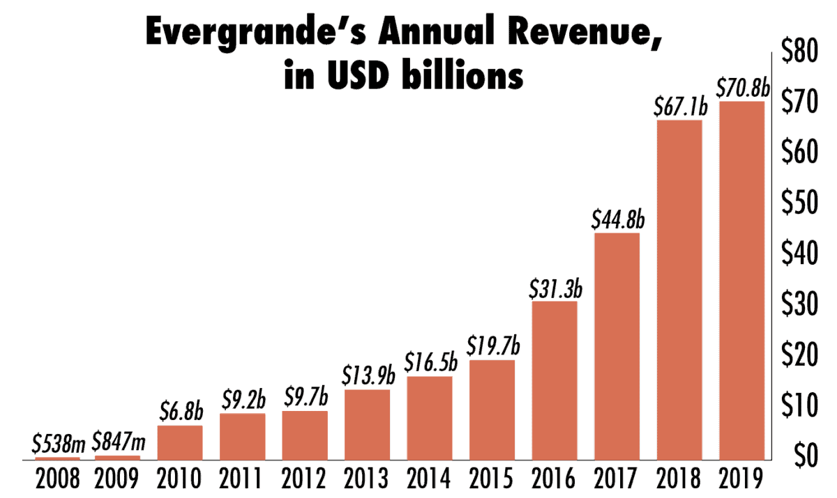 But Evergrande’s revenue has not kept pace with its asset growth or its debt. Revenue last year grew a relatively small $3.7 billion, particularly following a $22.3 billion jump from 2017 to 2018.
