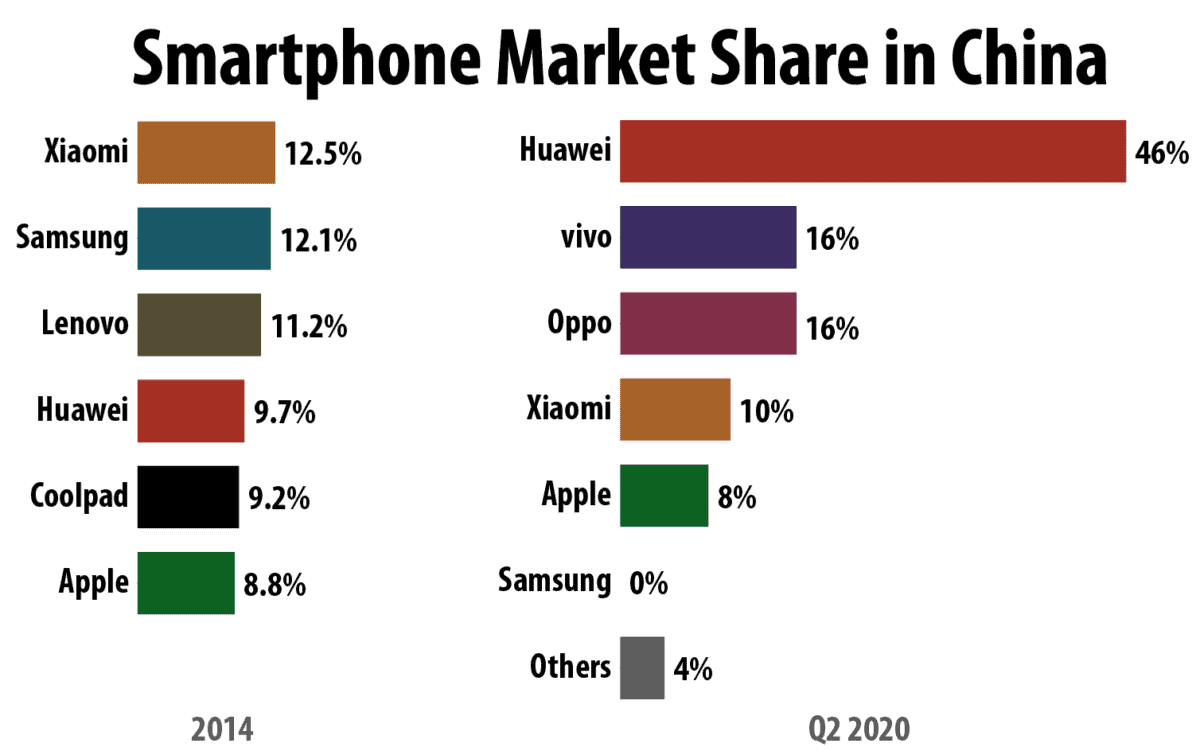 Data: International Data Corporation (2014); Counterpoint Research (Q2 2020)