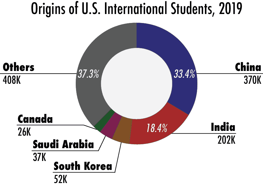 Soon after President Nixon’s opening to China in the 1970s, large numbers of Chinese students began attending American colleges and universities. Today, in fact, China is the largest source of international students at American colleges and universities. According to the Institute for International Education, there were nearly 370,000 students from China enrolled in American colleges and universities during the 2018-2019 academic year, the last year for which figures are available.