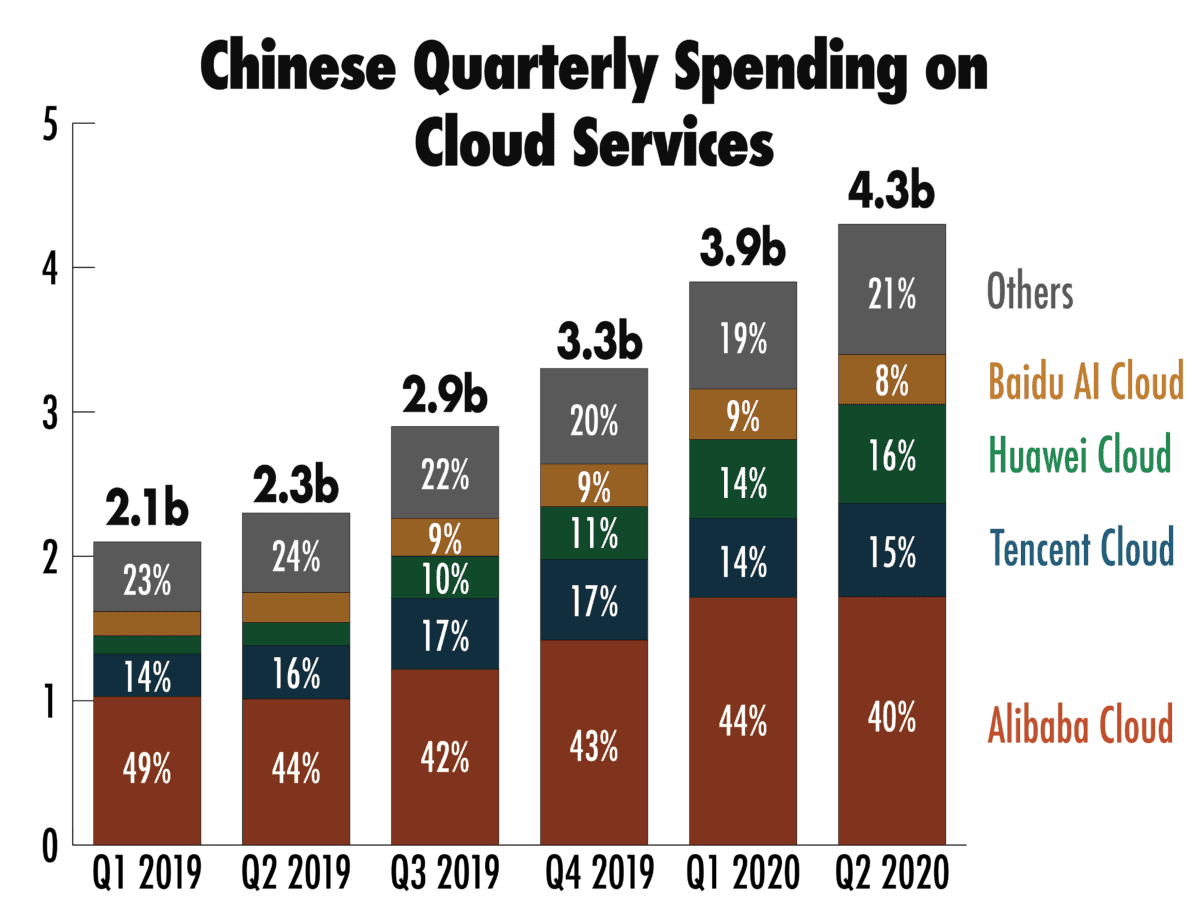 China’s biggest cloud computing firms are its internet giants. For example, Alibaba’s cloud service operations, run through a subsidiary called Aliyun, is the market leader with a 40 percent share of the market, followed by Huawei, the telecommunications giant, and Tencent Cloud, a division of the internet behemoth Tencent.