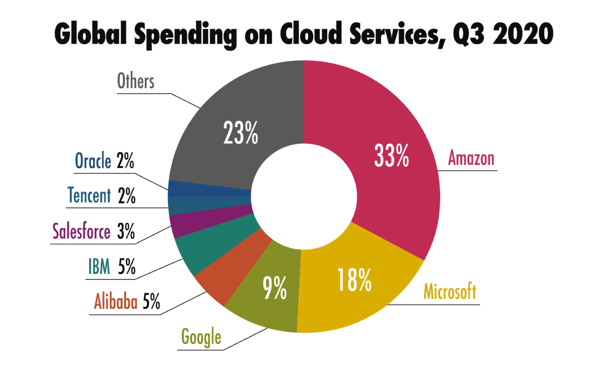 Amazon is a Goliath in the cloud sector. Amazon Web Services (AWS) continues to dominate the global market, occupying a third of the global market share. It was founded in 2006 and is a longtime leader in the field.