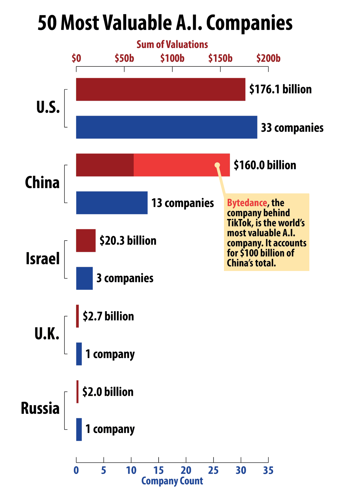 There’s no easy way to categorize A.I. firms, since Google, Facebook, Alibaba and Baidu all run on AI capabilities. But we built a list of 50 artificial intelligence firms cited by CB Insights, Crunchbase and Pitchbook, and sorted them by nation and market value. Roughly two-thirds of them are American. But the total value of Chinese and U.S. startups are roughly equal — due in large part to the skyrocketing value of ByteDance, China’s social media powerhouse.2The company’s valuation could jump to as much as $180 billion, according to recent reports, if it secures another funding round from Sequoia Capital and KKR.