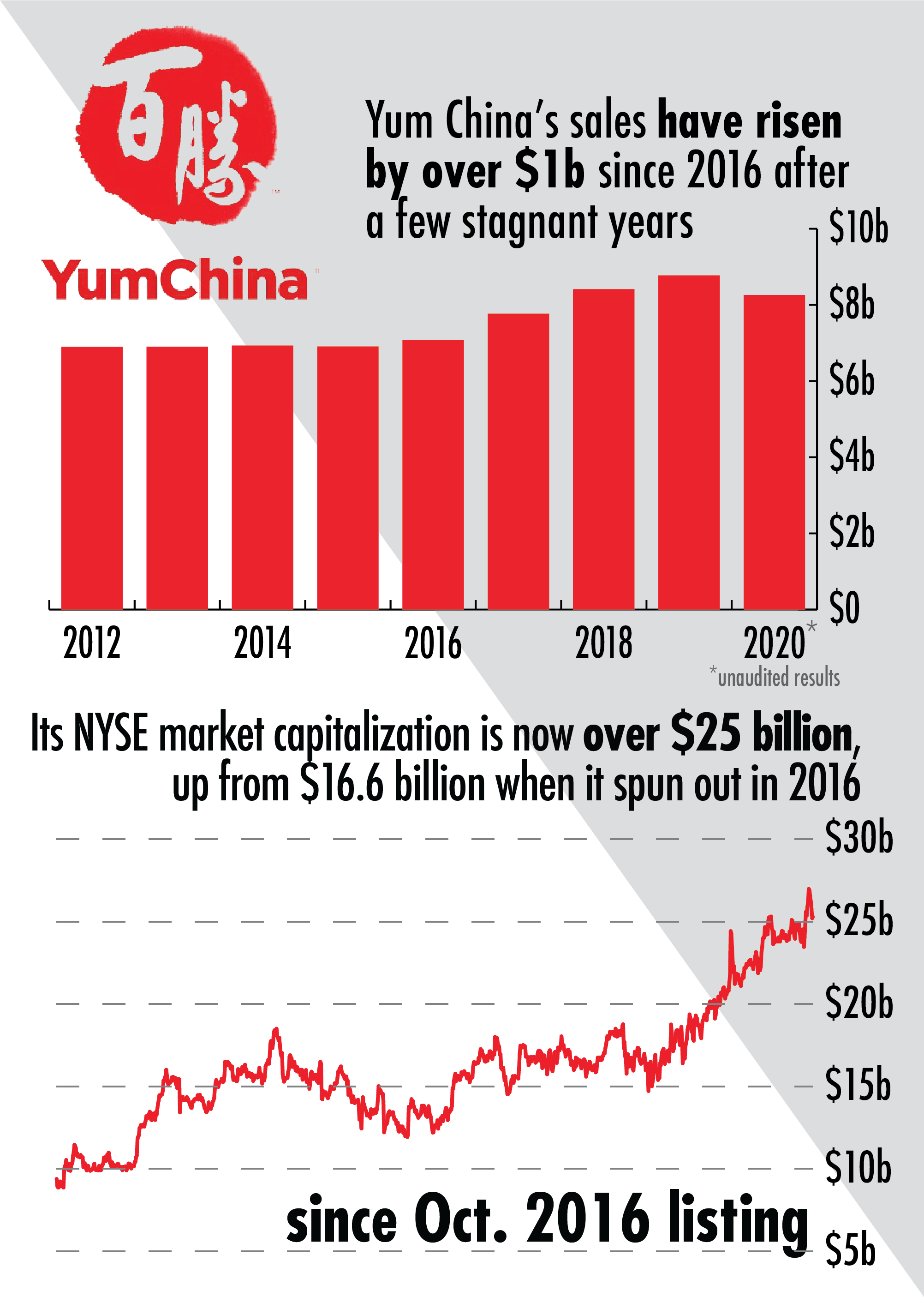 While Wat is credited for making the company nimble and agile, Yum China had early and smart help. In 2016, months before the spinoff became official, Primavera, a major Chinese private equity firm, and Ant Financial, whose Alipay digital payment system powers a significant chunk of Yum transactions, invested a combined $460 million in Yum China. Fred Hu, a former Goldman Sachs executive, became a non-executive chairman of the board. In 2018, Yum China attracted a buyout offer from a consortium led by Hillhouse Capital — including China Investment Corp., Beijing’s sovereign wealth fund — that valued the company at $17 billion. Yum China rejected the bid. Two and a half years later, Yum China’s market capitalization has grown more than 50 percent.