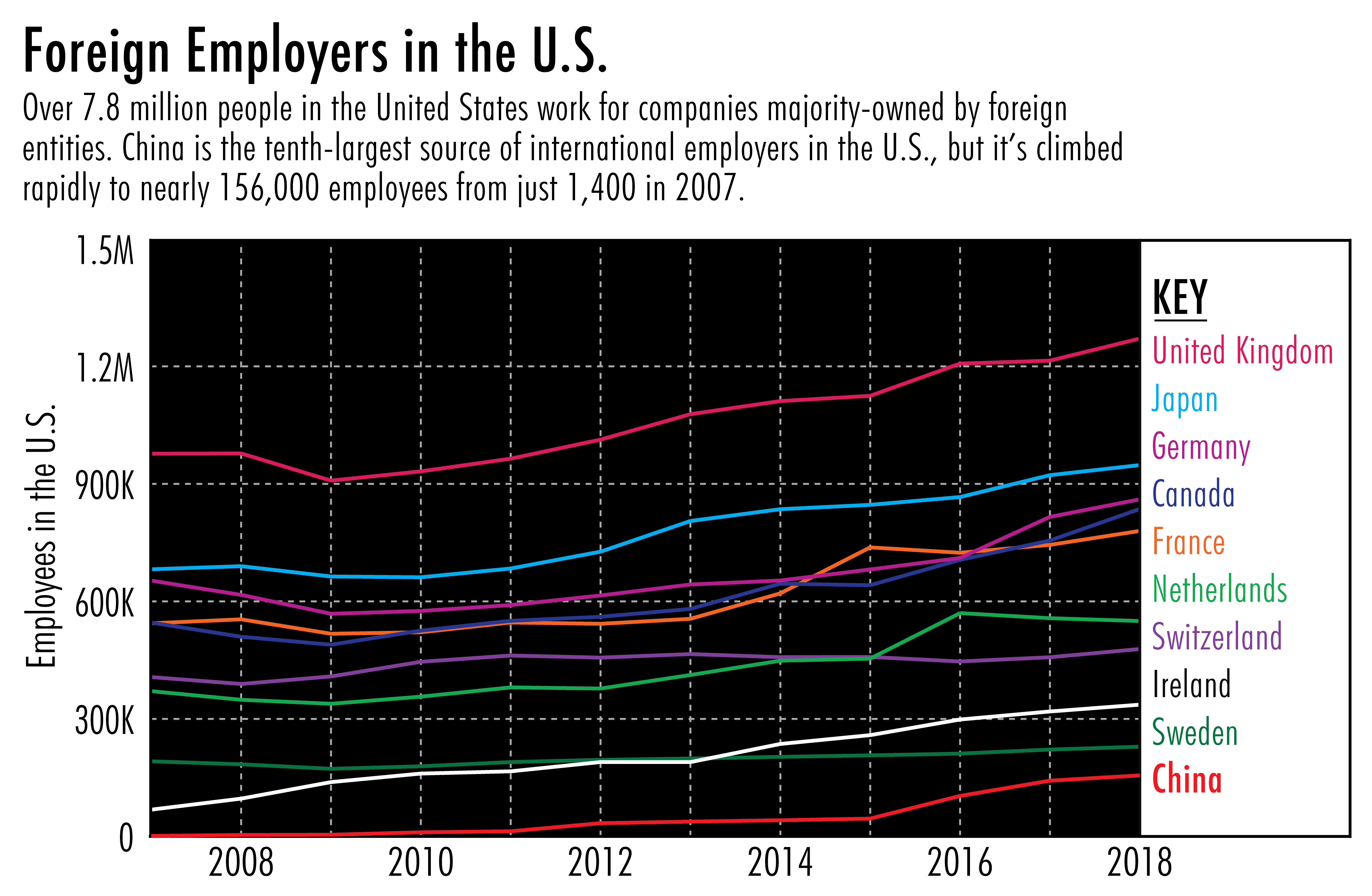 Of course, China’s footprint in the U.S. remains relatively small. Companies headquartered in the U.K., for instance, employed about 1.3 million American in 2018, likely through multinationals such as HSBC, BP or GSK, while Japanese and German firms also had a significant U.S. presence, particularly in the auto sector. In fact, even Swedish firms employed more workers in the U.S. than Chinese firms.1For Sweden, think of Volvo, H&M and Ikea.