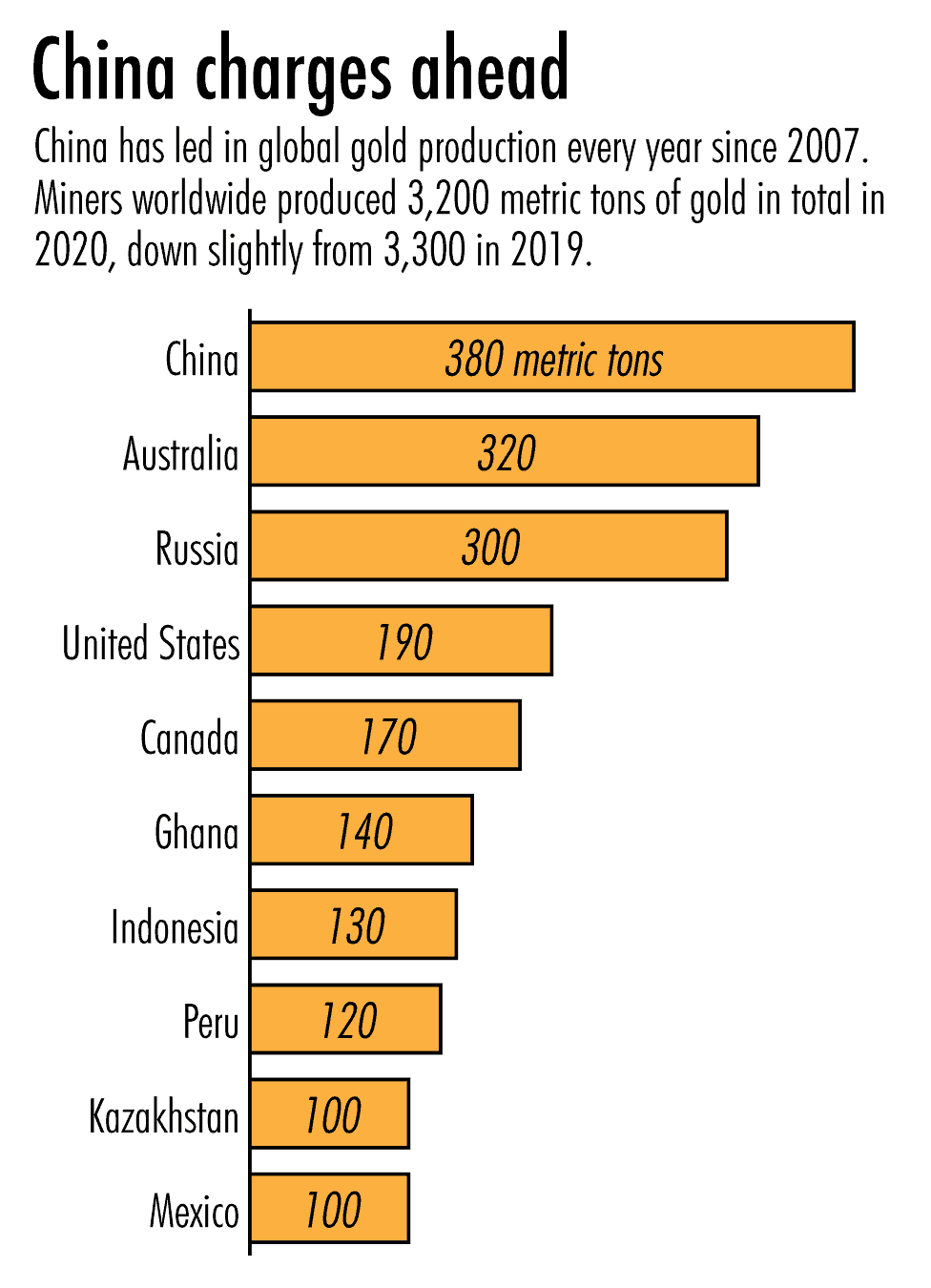 China, Australia, and Russia have been consistent leaders in gold production for over a decade, together accounting for nearly a third of global output in 2020, according to estimates from the U.S. Geological Survey. The United States, Canada, Peru, and South Africa have historically fallen just behind.