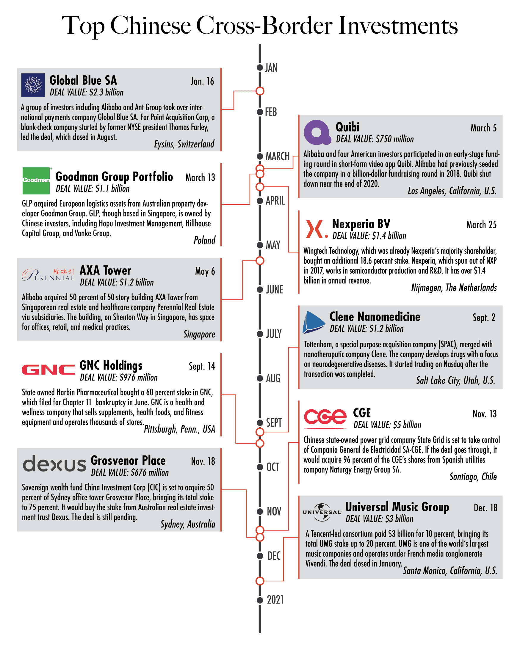 State Grid, for example, increasingly commands Chile’s power grid: the company said it would pay $2.2 billion for control of electricity distributor Chilquinta, which provides power to 2 million people, in late 2019, in addition to its pending $5 billion CGE stake. The likes of Alibaba, GLP, and China Investment Corporation (CIC) all meanwhile made pricey investments in international property last year. CIC’s pending $676 million purchase of the majority stake in Australian office tower Grosvenor Place is in line with its other investments, which include holdings in major New York City office buildings.
