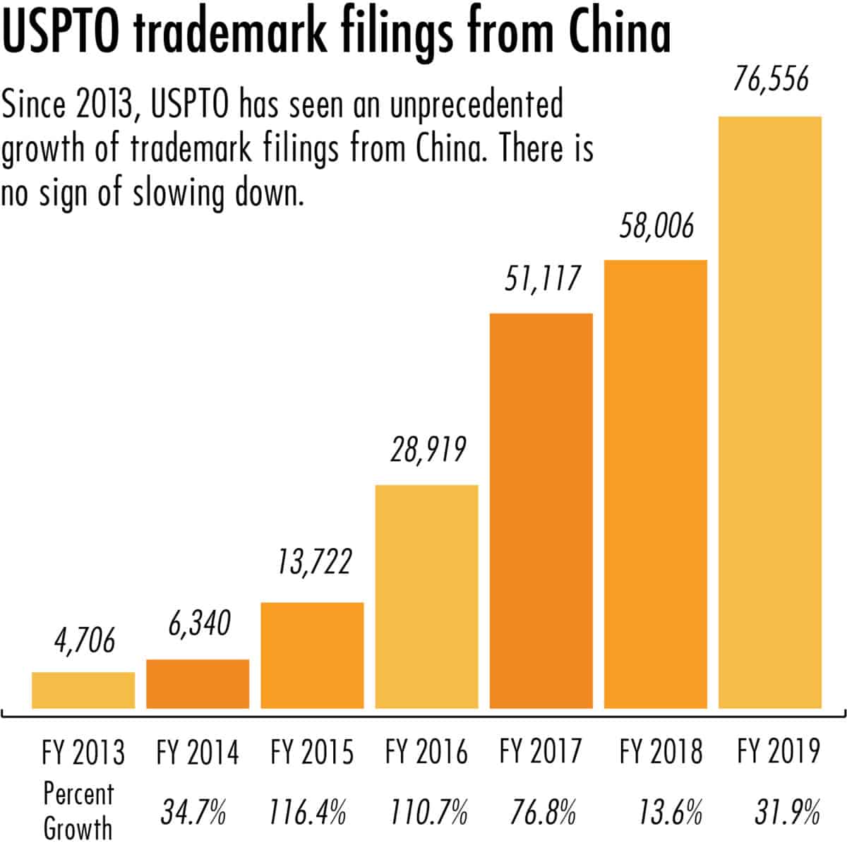 The surge in Chinese trademark applications in recent years shows little sign of abating. The USPTO had received 77,305 filings from China as of May 31 this year — just under half of the total filed by U.S.-based businesses, and a more-than three fold increase over the same period last year.