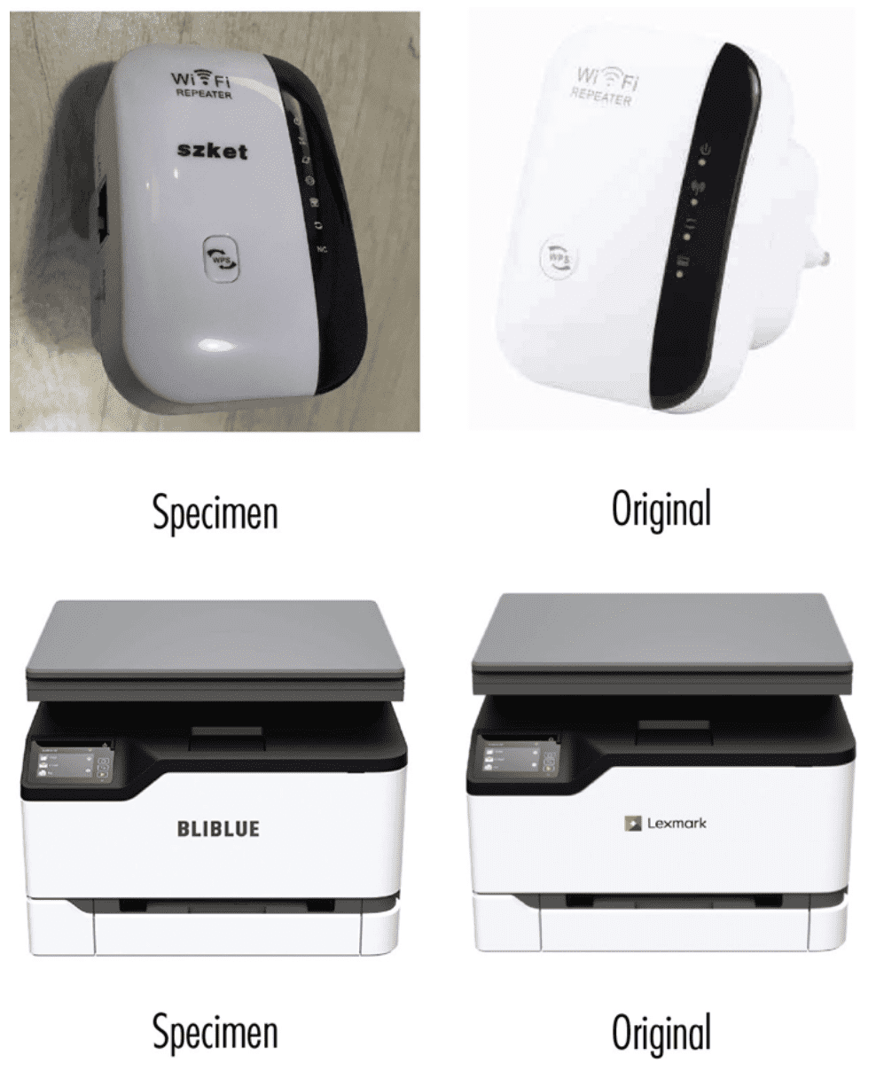 Source: szket via USPTO.report, BLIBLUE via USPTO.report, WiFi Router via Amazon, Lexmark printer via Lexmark.