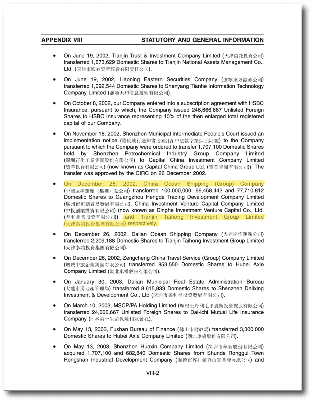 Ping An’s prospectus records the transfer of 77,710,812 domestic shares from COSCO to the Tianjin Taihong Investment Group in December 2002. Taihong’s effective 3.24 percent stake made it Ping An’s 13th largest shareholder at the time of the 2004 IPO.