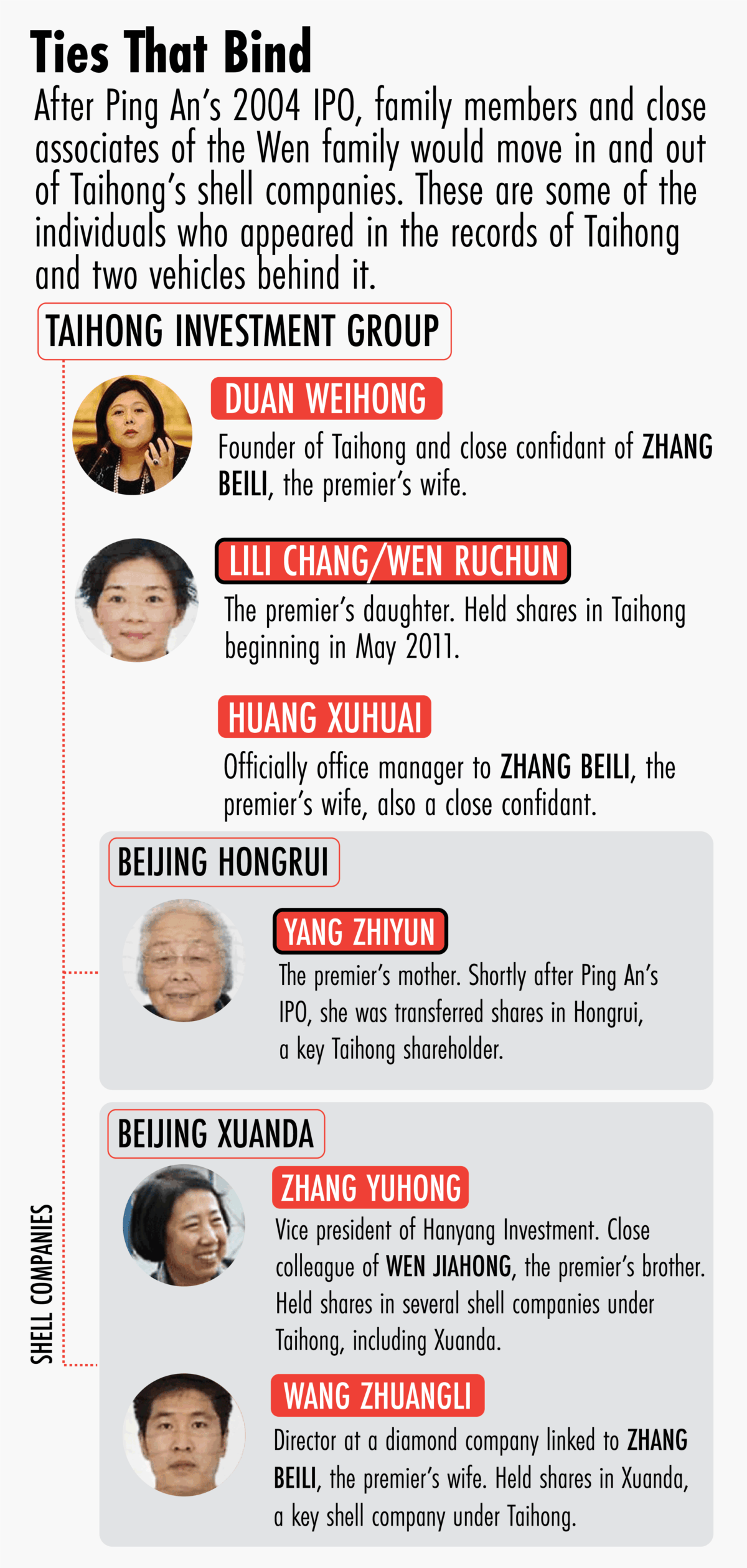 Last month, about four years after Duan’s disappearance, her ex-husband and business partner, Desmond Shum, published Red Roulette, a tell-all book about the couple’s life and business dealings with China’s political elites. In it, Shum confirms that he and his ex-wife helped the relatives of China’s prime minister gain a stake in the financial services giant. This week, The Wire revisits the Ping An deal, tracing the steps Taihong took to bring in the relatives and associates of the Wen family, and details who was involved and how their stake was concealed.