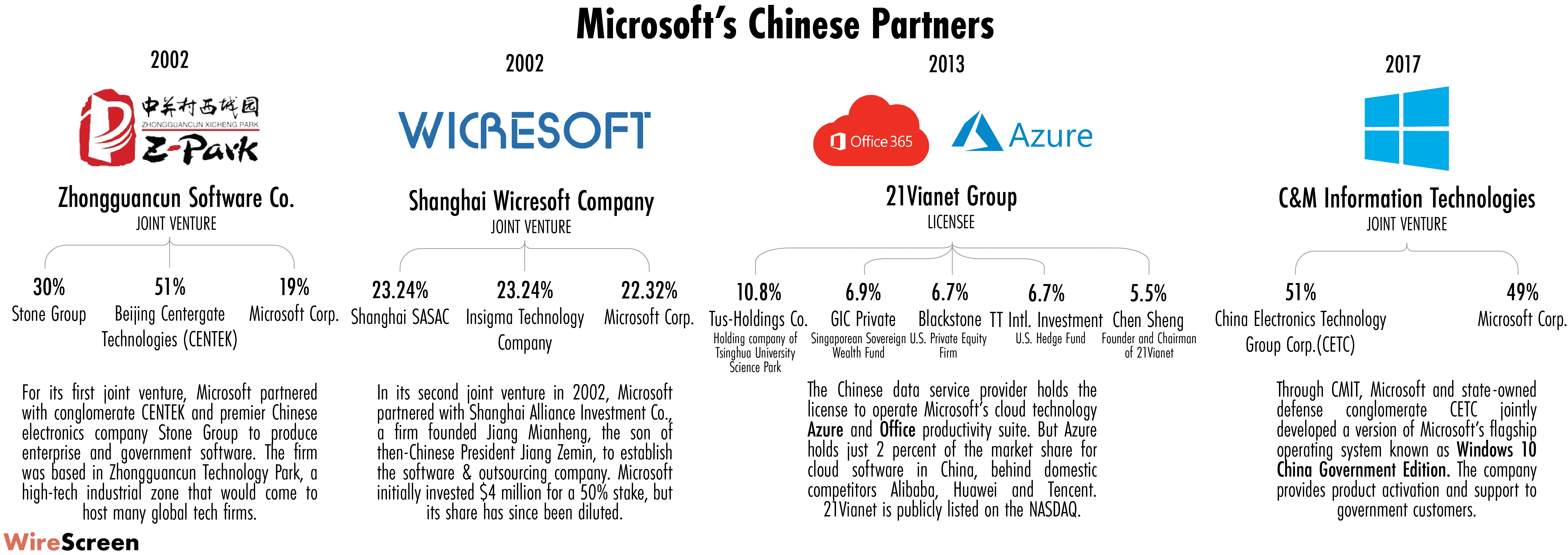 Microsoft established its first joint venture with Chinese conglomerate CENTEK and electronics company Stone Group in 2002 to develop software for organizations and government. A second JV followed later that year with an investment firm run by then-Chinese President Jiang Zemin’s son to establish Wicresoft, a software and outsourcing firm. Its main product in China has, though, long been the Windows operating system. Close to 90 percent of Chinese desktop users still run Windows, according to StatCounter, including the central government.