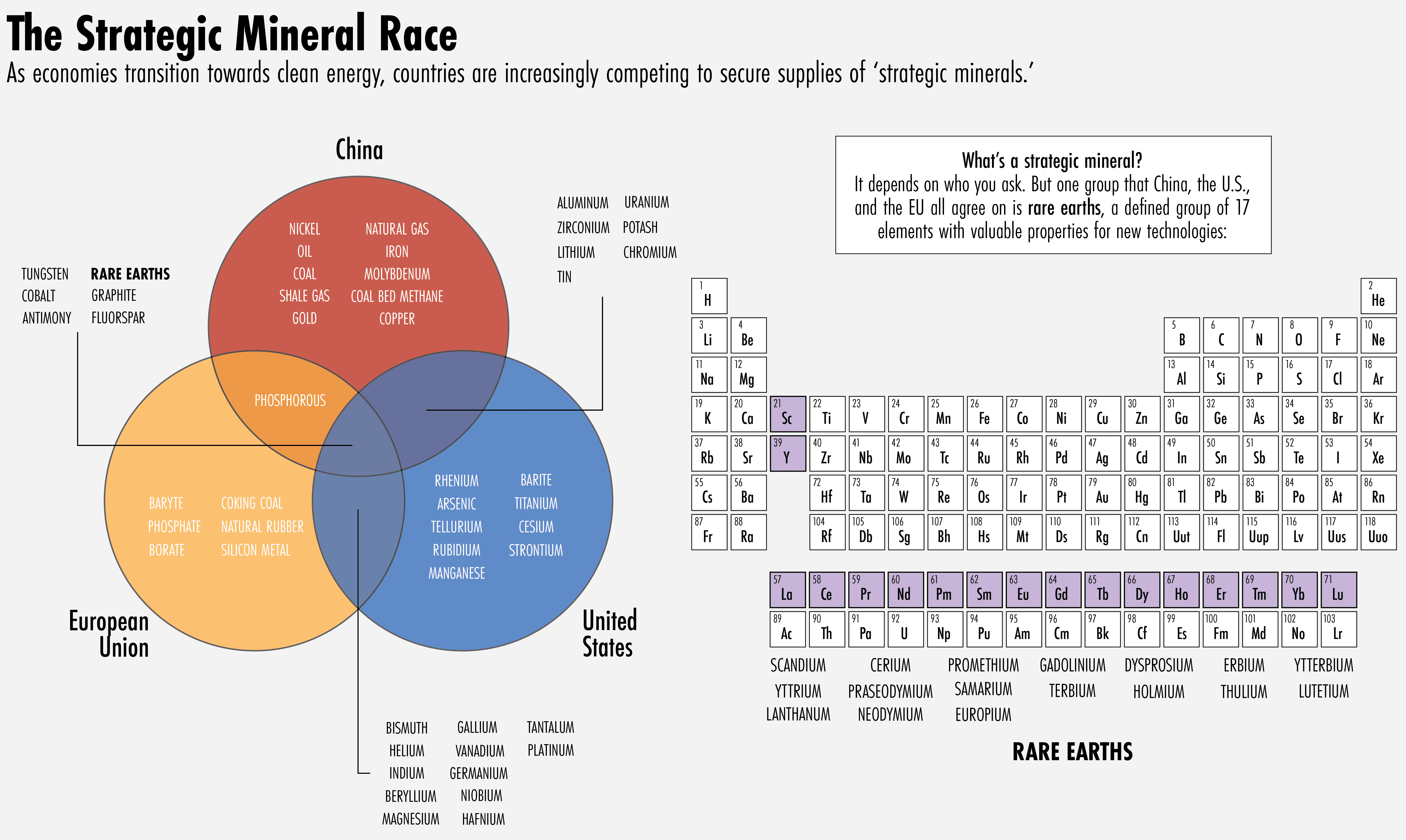 Unlike strategic minerals, rare earths are a defined group of 17 elements. They are not, in fact, rare, but are seldom found in concentrations high enough to be mined on their own, and are instead collected as byproducts of other mining. Rare earths contain properties that make them essential to the new economy: they are magnetic and highly electrically conductive, playing crucial roles in components for electric cars, batteries, and smartphone touch screens.