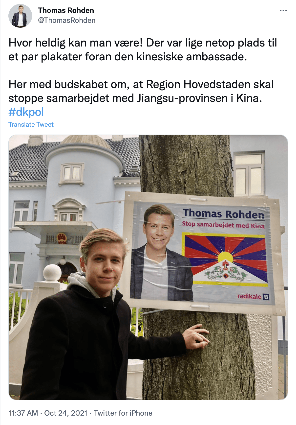 Rohden’s posters sported an image of the Tibetan flag, and while they weren’t likely to be seen by many potential voters, they were immediately noticed by Rohden’s target audience: the Chinese embassy across the street. Rohden, 26, has emerged as a staunch critic of Beijing’s policies in Tibet, Hong Kong and Xinjiang, and when the posters were mysteriously taken down only hours later, he told the media he had a strong suspicion the Chinese embassy was behind it.