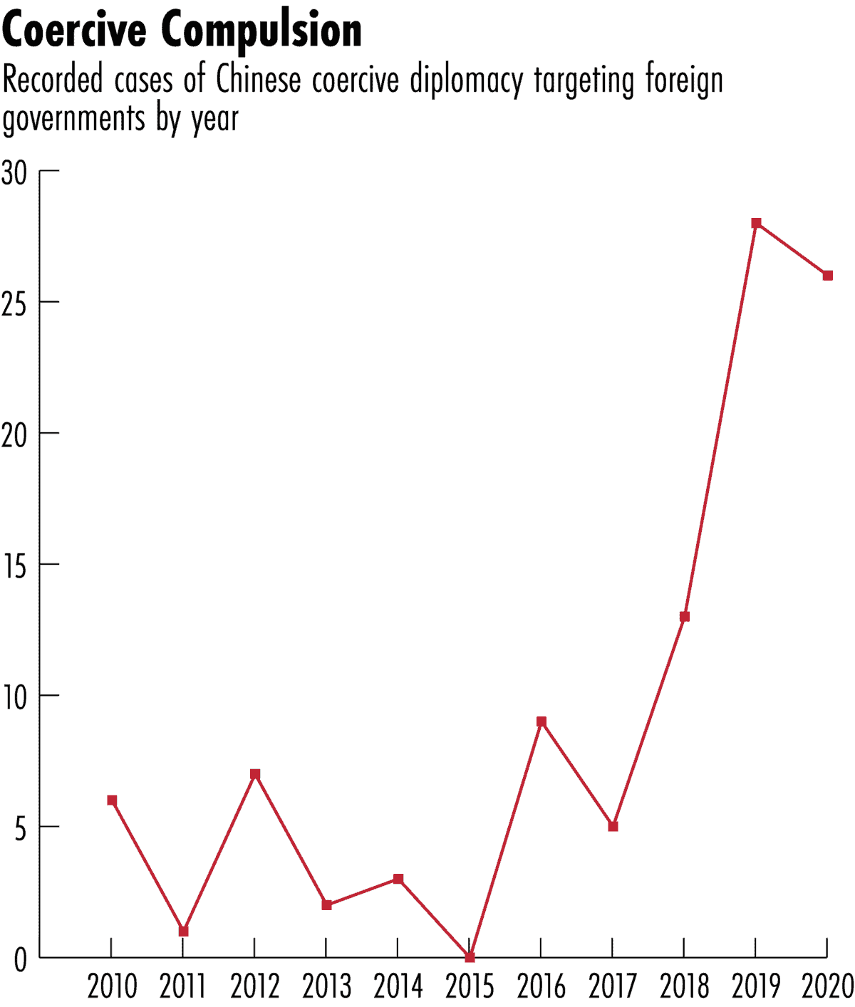 Indeed, the aggregate of these small wins around the world added up to a big win for China. Beijing was moving the needle and shaping the global discourse on its most dear core interests. But as many observers have noted, China’s coercion has taken a new direction of late with its boisterous and bullying ‘wolf warrior diplomacy’ under President Xi Jinping. Whereas Beijing’s coercive art form was once clearly distinguished by its narrow rather than broad strokes, bravado has taken over. A study by the Australian Strategic Policy Institute found that the intensity and frequency of China’s coercive diplomacy grew substantially from 2018 on. Over half the incidents of state-issued threats by China since 2010 took place in 2020 alone. Most recently, the small Baltic state of Lithuania is facing the consequences of China’s trade weapon over the status of Taiwan.