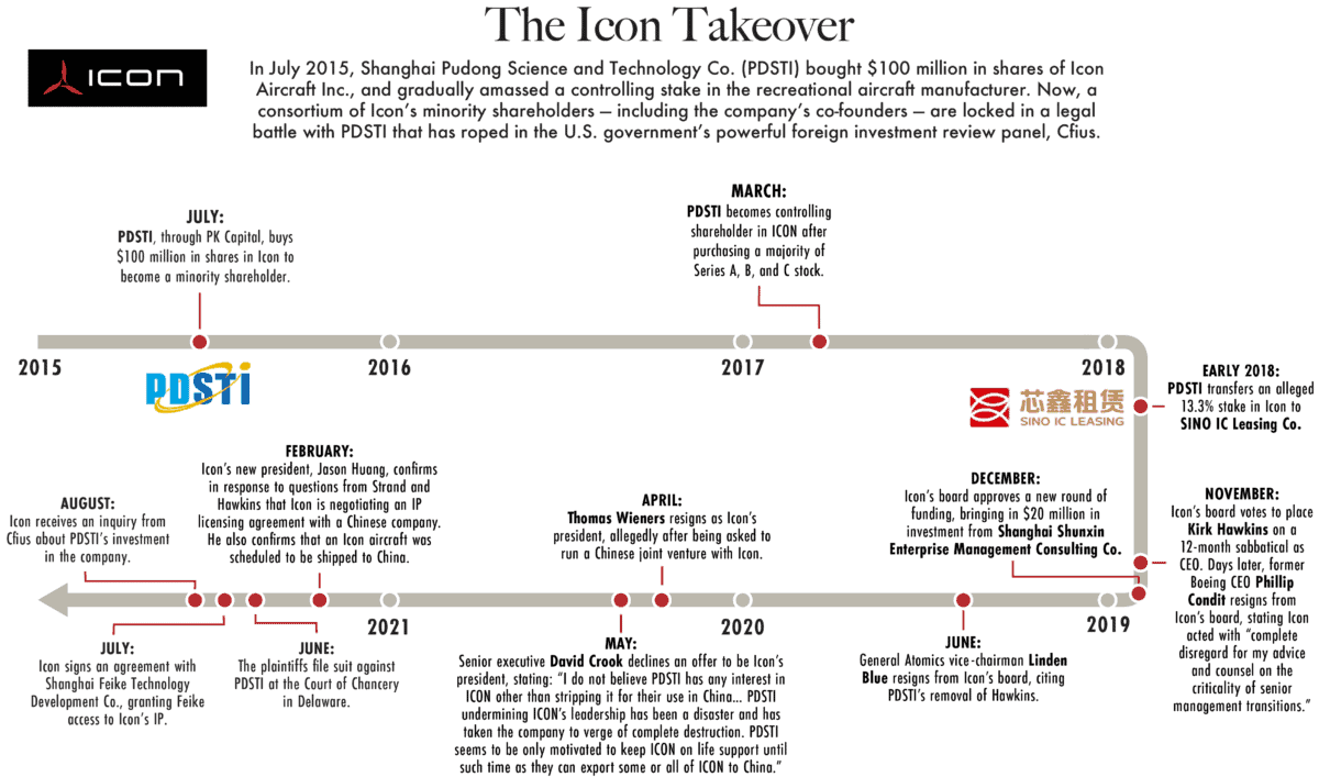 But the A5’s maker, Icon Aviation Inc., is currently at the center of a bitter dispute between some of its minority shareholders and its biggest investor, China’s state-owned Shanghai Pudong Science and Technology Investment Co. (PDSTI). The minority shareholders alleged in a Delaware court last June that PDSTI has hobbled Icon’s development while planning to transfer its technology — which, they say, could have military applications — back to China.