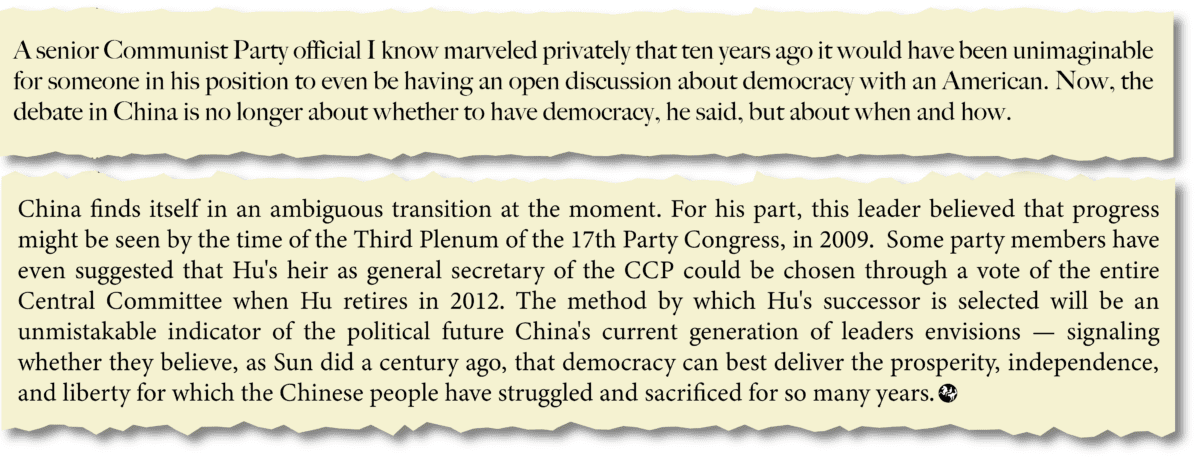 Thornton also began writing about China for a wider audience. In an essay in the January/February 2008 issue of the influential magazine, Foreign Affairs, Thornton talked up the prospects for democracy in China. Pointing to elections that have been held intermittently in some Chinese villages, Thornton expressed hope that they would spread up to China’s townships, counties, cities and provinces.