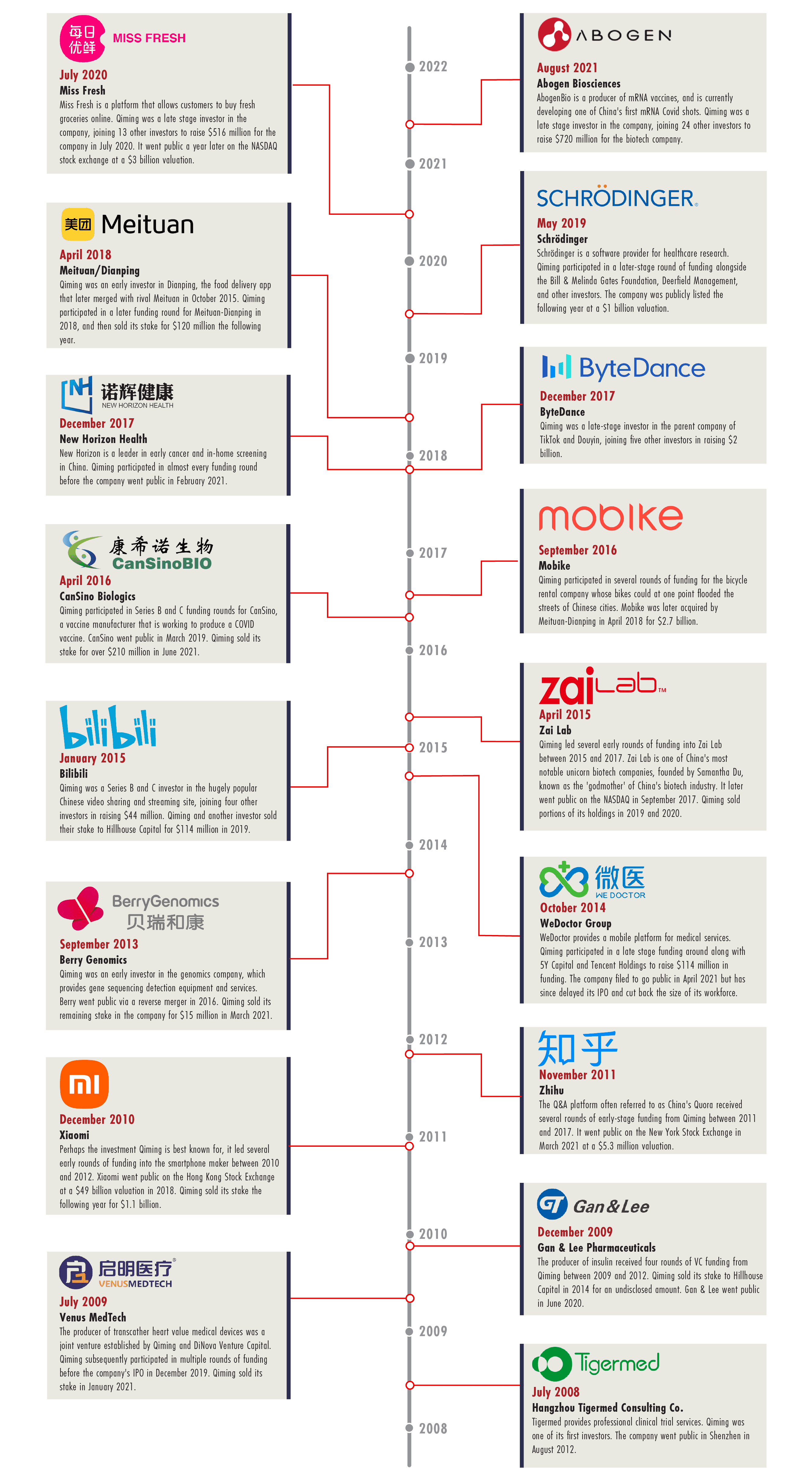 Qiming has backed over 400 companies since its founding, more than 50 of which have gone public. The firm specializes in early-stage investments: 70 percent of its investments are in the Series A funding round, according to Qiming’s website.1Series A typically refers to a company’s first significant round of venture capital funding with institutional investors. What follows is a selection of some of the deals the firm has participated in since 2008: