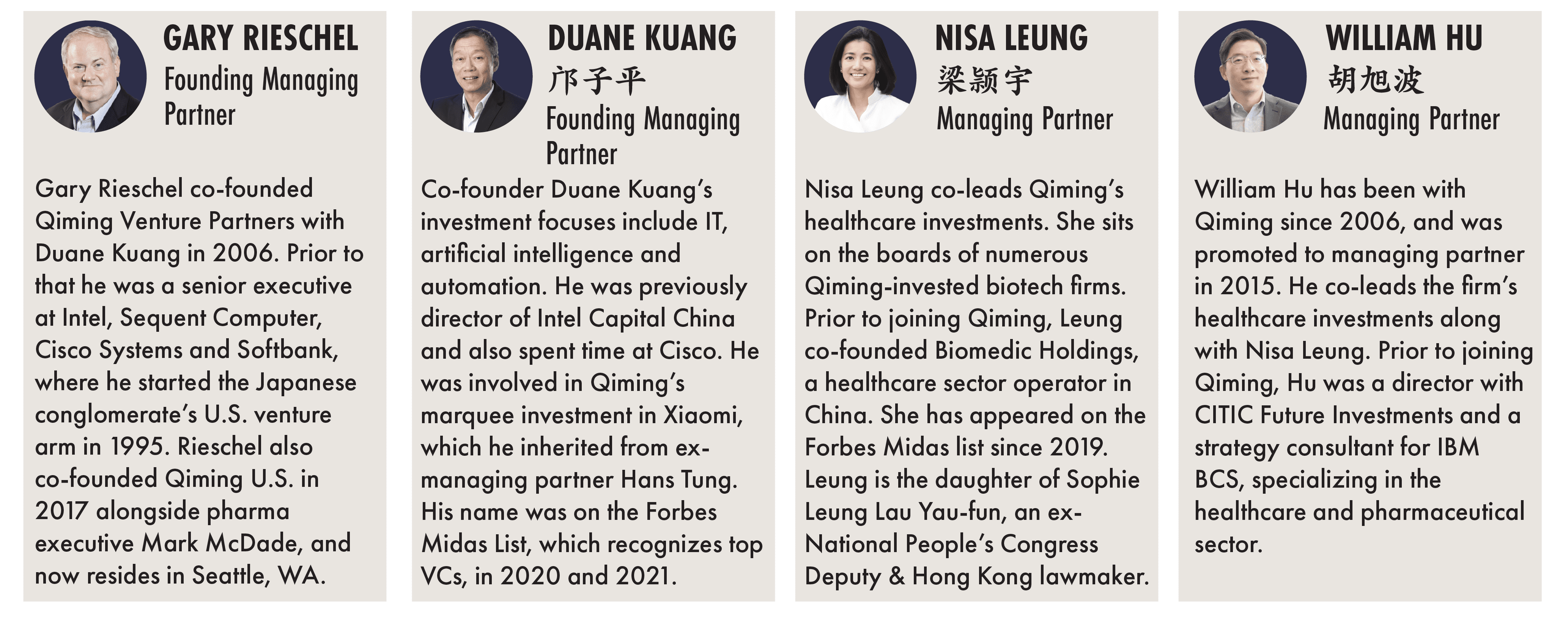 Gary Rieschel and Duane Kuang co-founded Qiming in Shanghai in 2006. All four of the firm’s current managing partners have been with Qiming since its founding. Rieschel and ex-pharma executive Mark McDade started Qiming U.S. with the firm’s first independent U.S.-based fund in 2017.