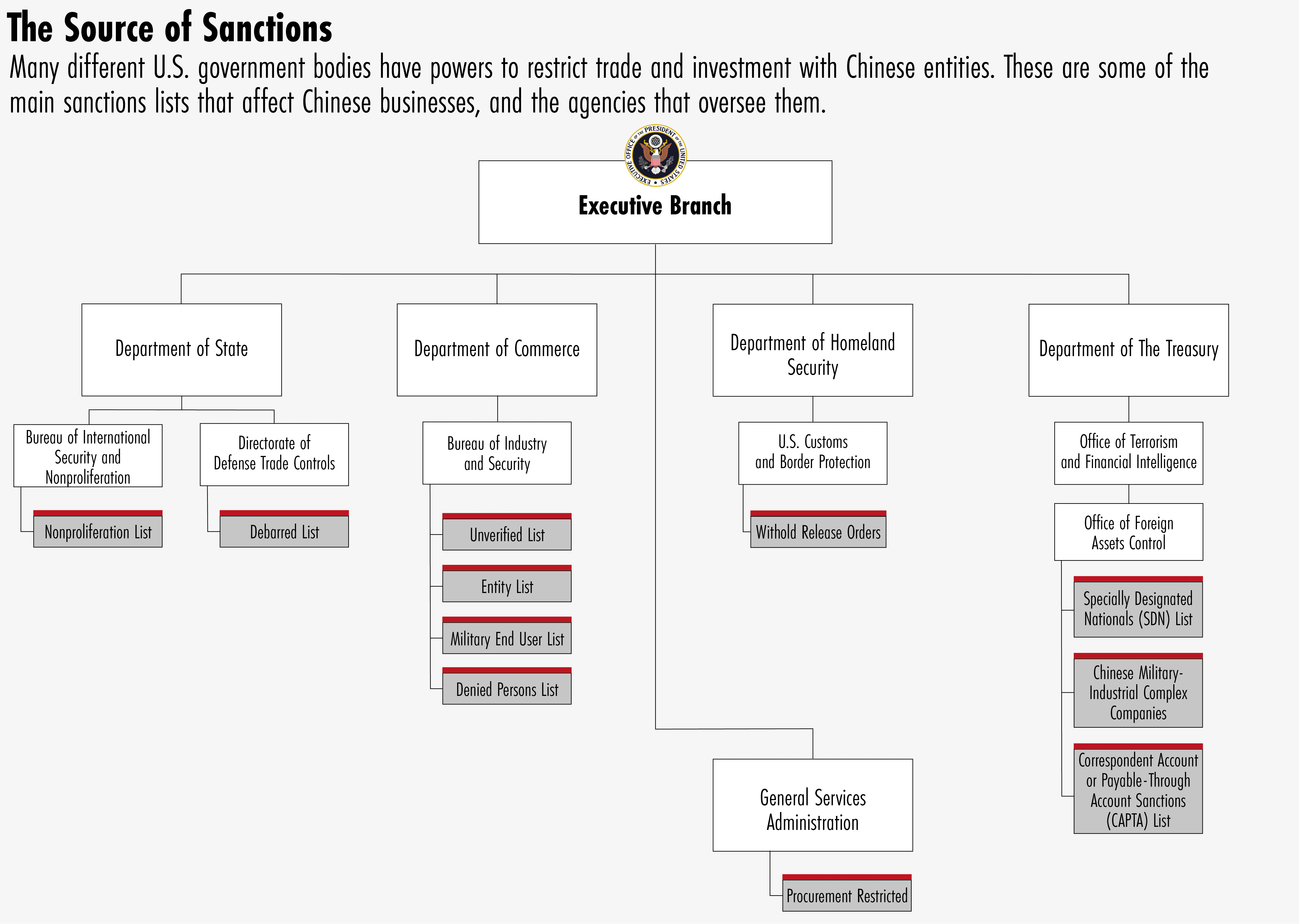 At least five federal agencies oversee the designation and enforcement of sanctions against Chinese companies. Those agencies manage multiple lists that impose different levels of restrictions on doing business. The lists equip the U.S. government with “a range of actions between putting a drag on a company’s business versus maybe trying to shut them down,” says Daniel Fisher-Owens, a partner at Berliner Corcoran & Rowe who specializes in sanctions and export controls.