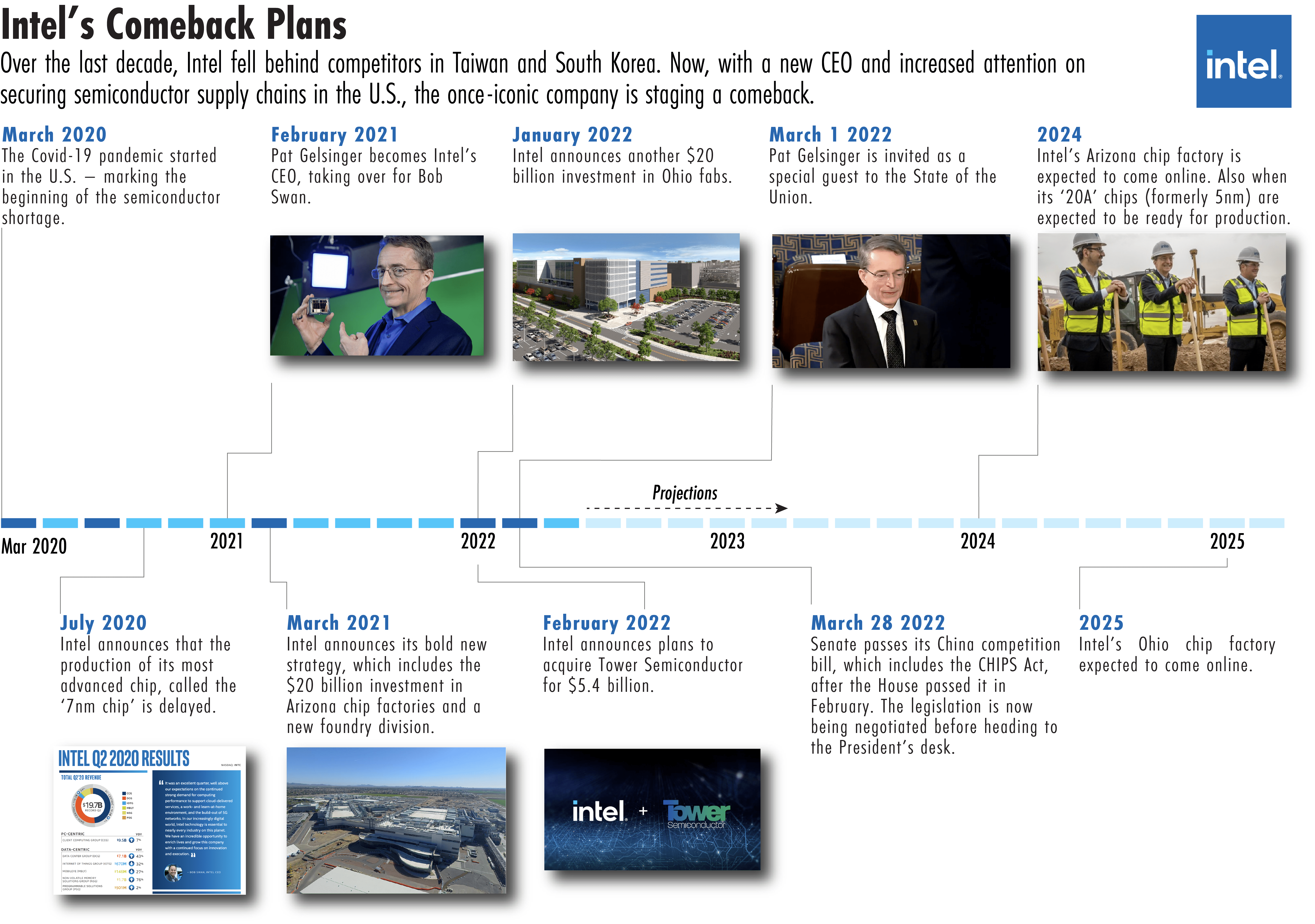 In addition to the Ohio and Arizona fabs, Gelsinger announced that Intel’s long-delayed 7 nanometer chips would be ready for manufacturing by the end of 2021 (they were) and that Intel’s 20A chips (formerly called 5 nanometer chips) will be ready by 2024. Intel also said that it plans to acquire Tower Semiconductor, an Israeli chip manufacturer, for $5.4 billion, a move that will help Intel produce “legacy” chips, which are less technologically advanced.