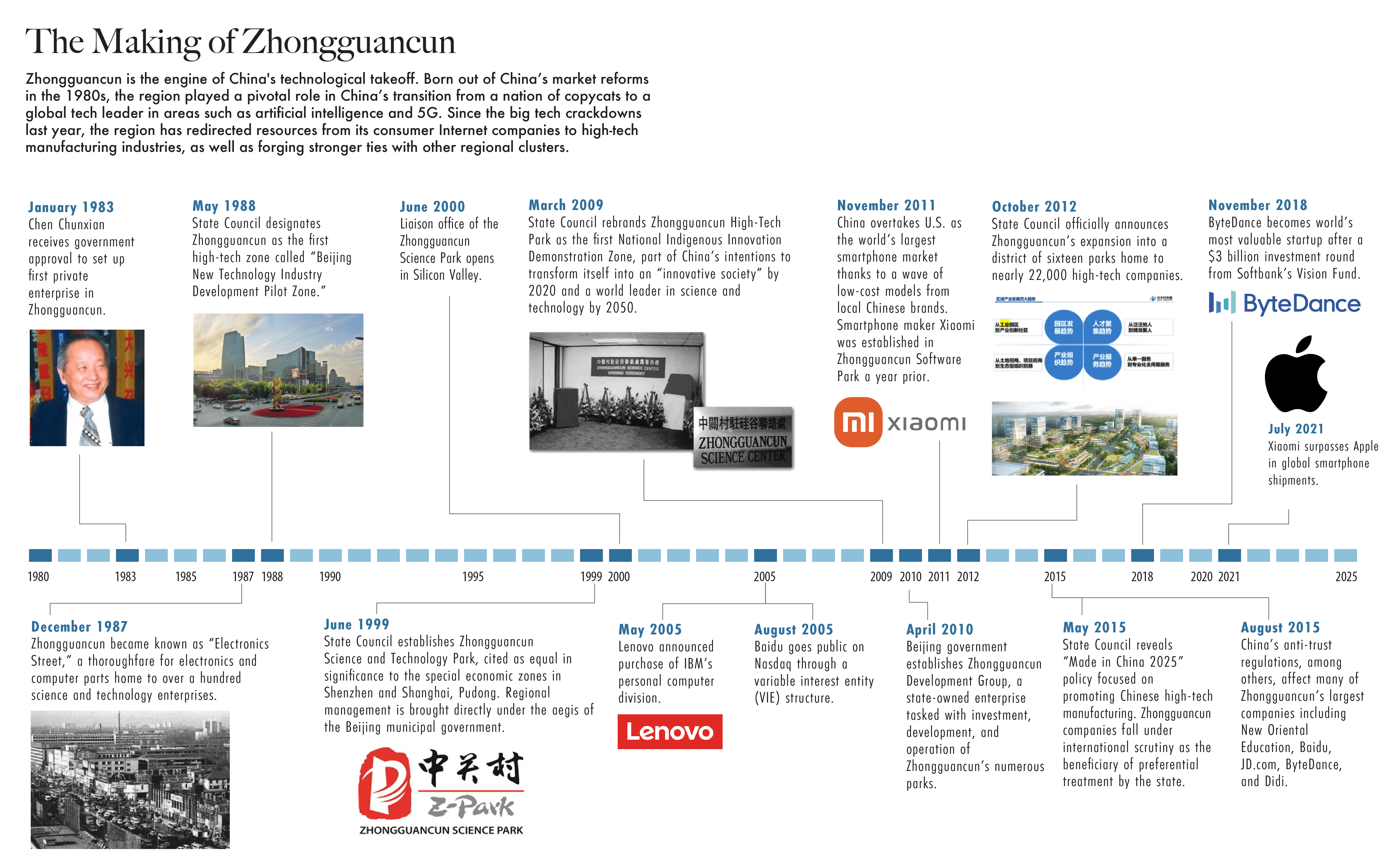In 1997, Lenovo overtook its foreign competitors in sales to become China’s largest PC maker. Alerted to its potential, the Communist Party further bolstered Zhongguancun in 1999, designating the region as the Zhongguancun Science and Technology Park and elevating its status to that of the special economic zones in Shenzhen and Shanghai. The park’s management was brought under the aegis of the State Council and the Beijing municipal government. New private and public funds poured into R&D and infrastructure. American tech giants, such as Microsoft and Google, set up research outposts in the district. And American venture funding came too.