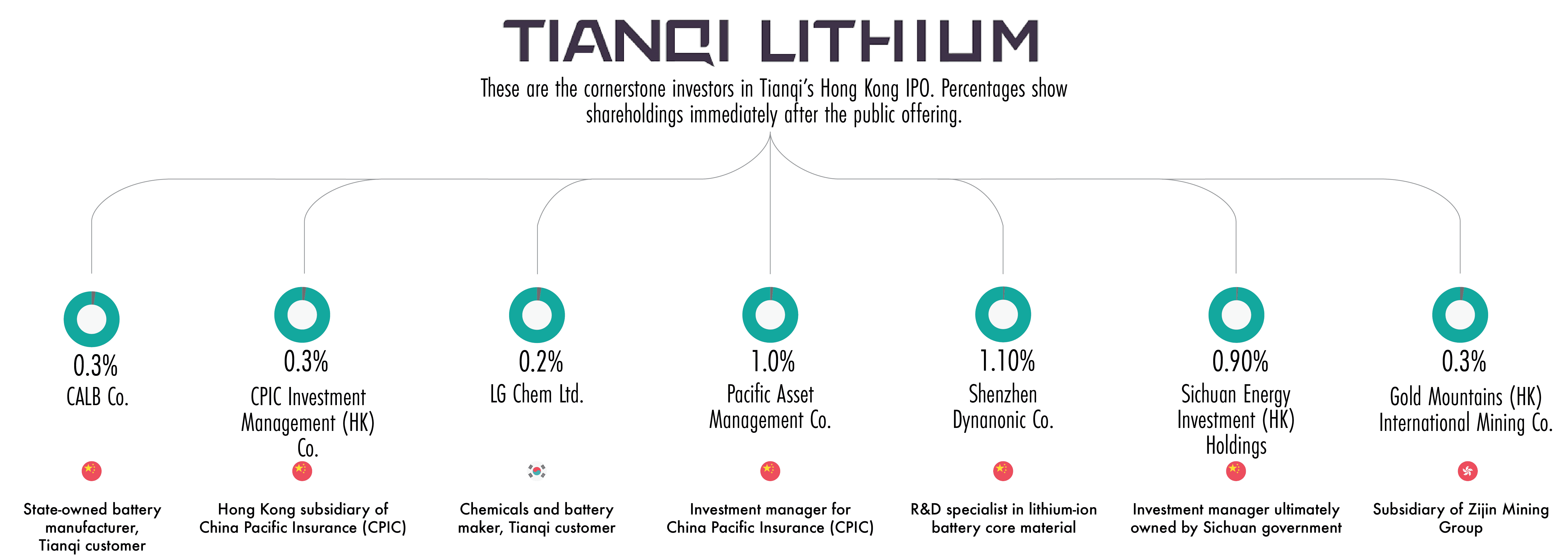 One third of the new shares issued in Tianqi were taken up by cornerstone investors. 1Cornerstone investors are investors who commit in advance to invest a fixed amount or a fixed number of shares in an IPO. These were the cornerstone investors in Tianqi’s Hong Kong IPO: