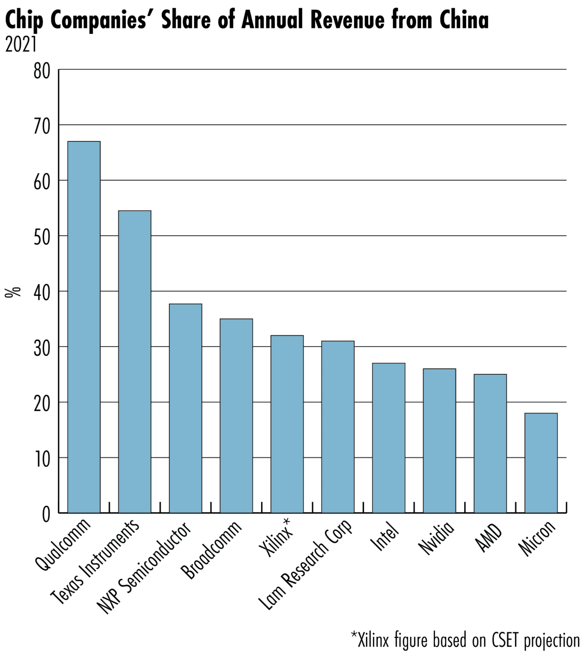 Chipmakers are among the most dependent on China for their sales among U.S. multinationals that disclose their regional revenue breakdowns.