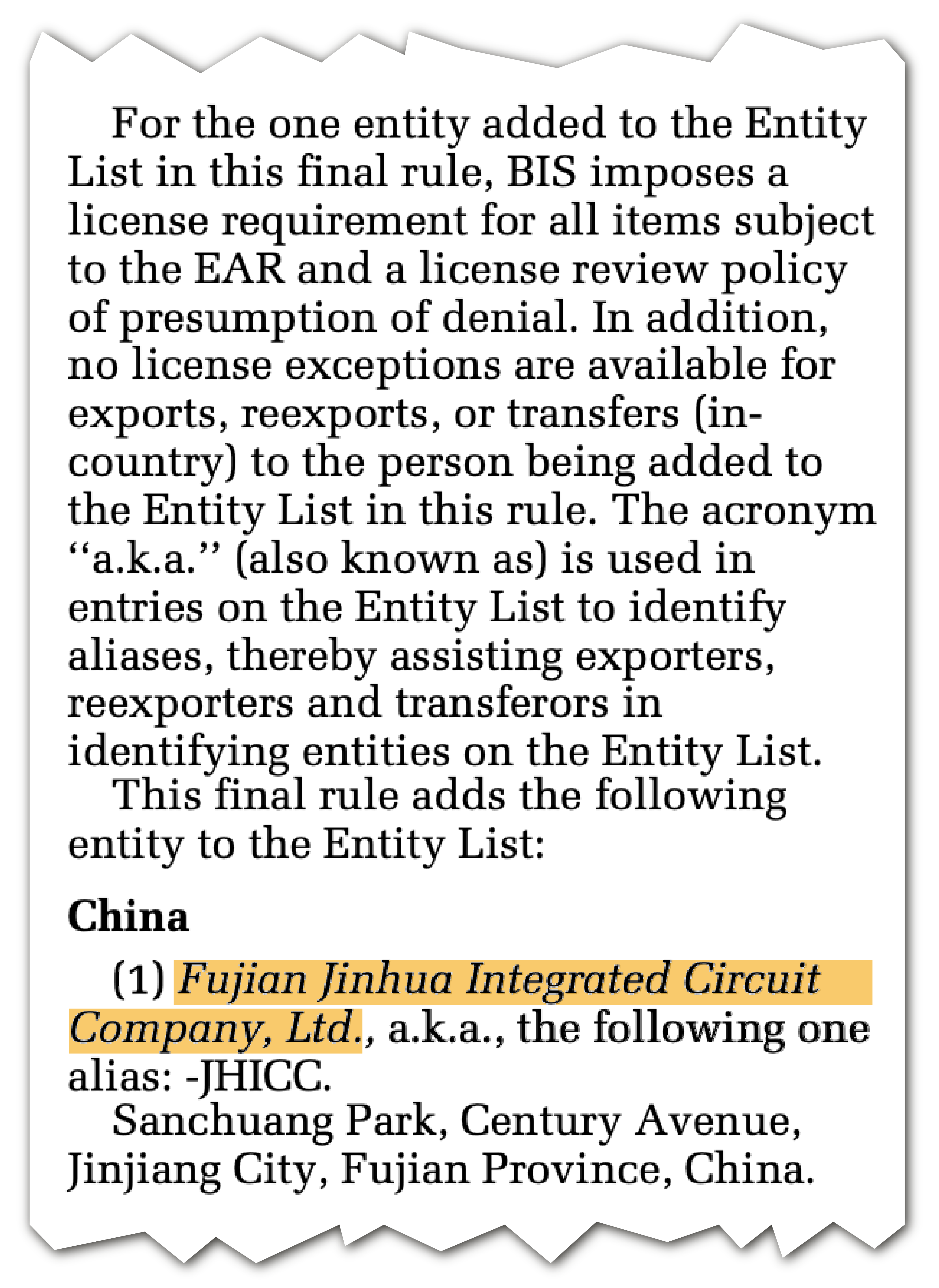 [Note: Fujian Jinhua is a Chinese state-owned manufacturer of memory chips which was accused of stealing trade secrets from American chipmaker Micron. After Micron sued Fujian Jinhua for patent infringement, Fujian Jinhua counter-sued Micron in a Chinese court and won. In response, the Trump administration imposed tough export controls on Fujian Jinhua.]