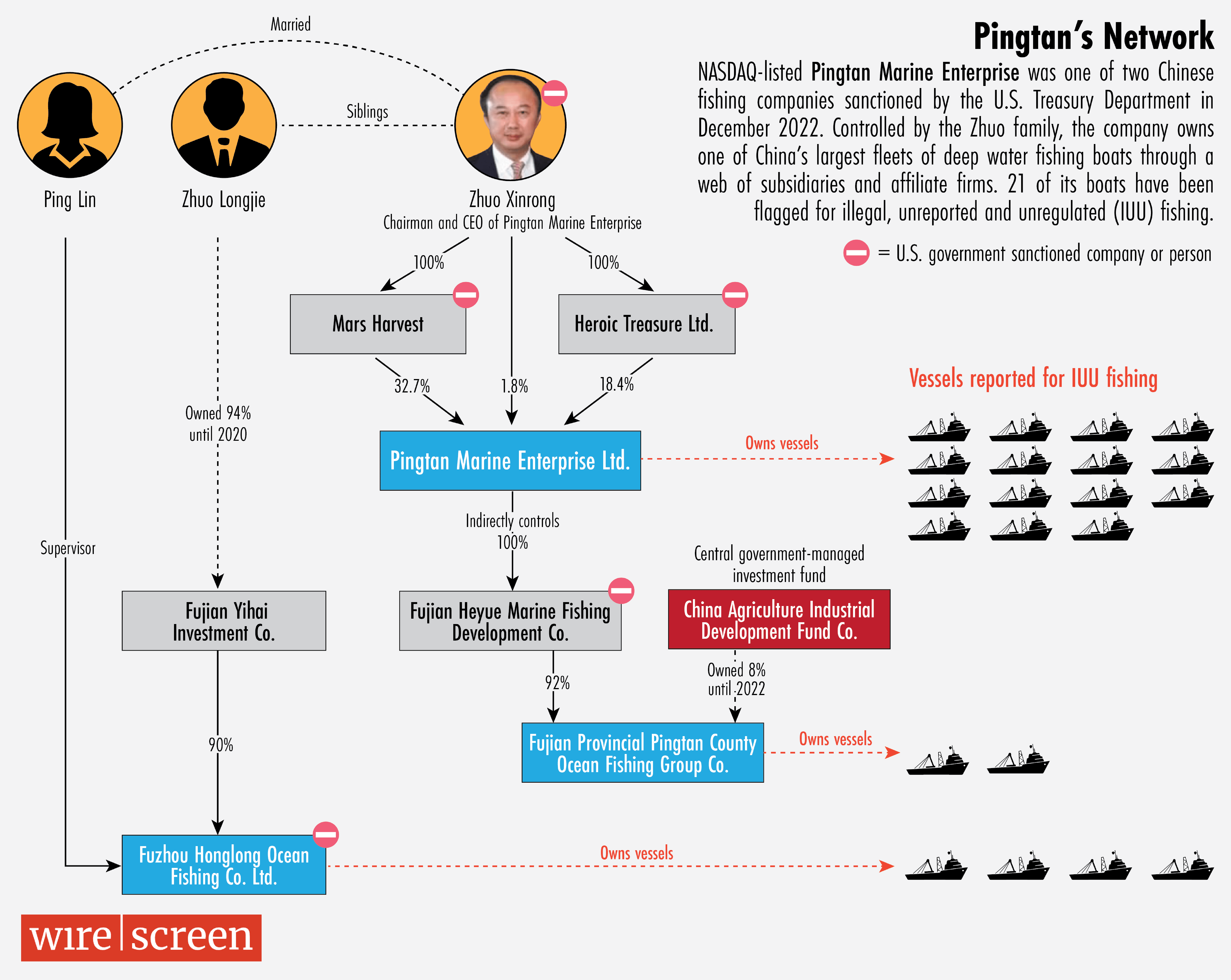 Fujian-based Pingtan Marine Enterprise has one of China’s largest distant water fishing fleets. It also ranks first in terms of the number of vessels flagged for illegal fishing. Last week, Treasury officials sanctioned Pingtan and its chairman and chief executive Zhuo Xinrong, freezing any U.S.-based assets held by Pingtan and its CEO. American investors will also have to offload any financial stake in Pingtan within 90 days.