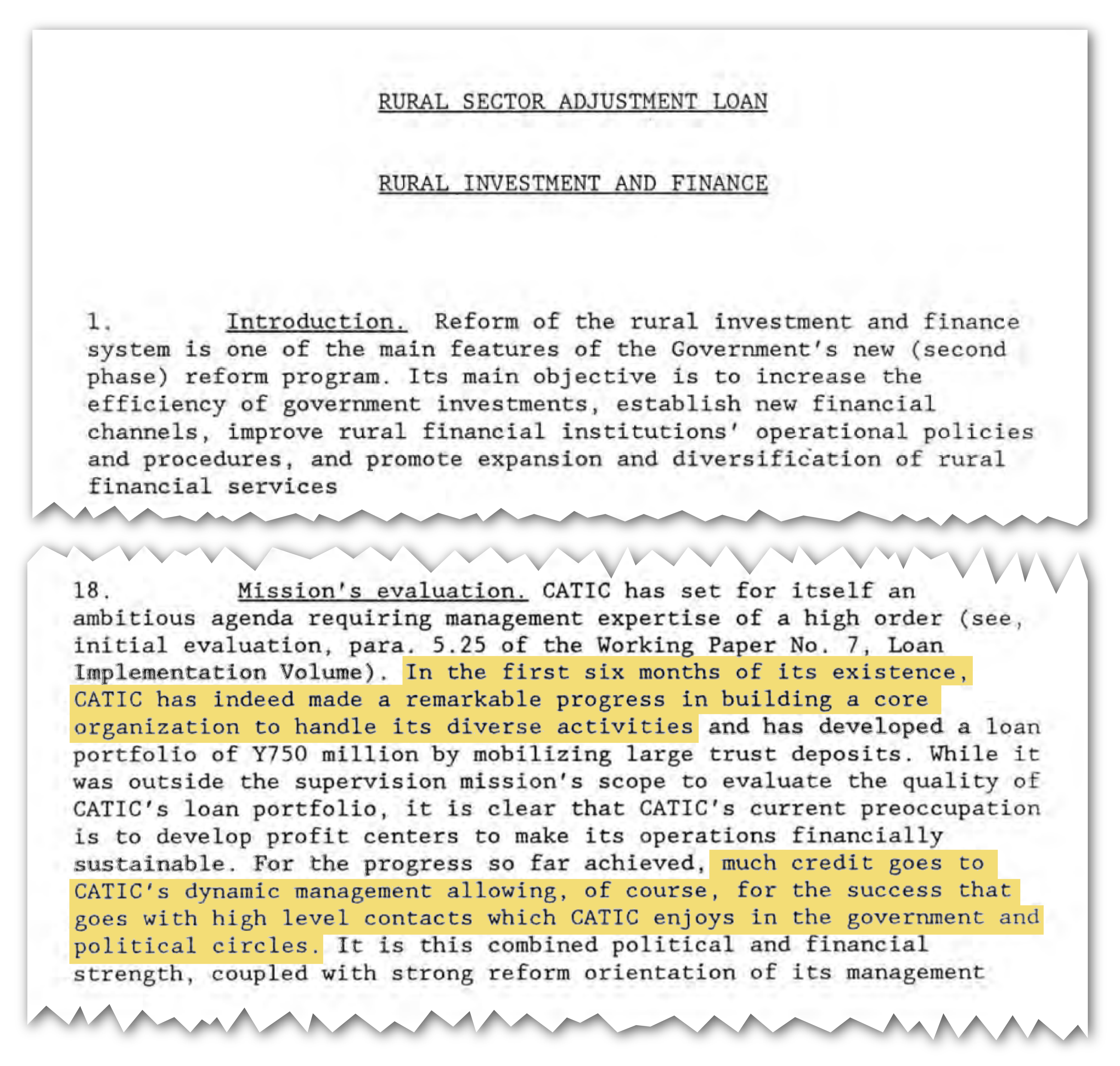His reputation now well established, Wang left the Rural Development Research Center in 1988, when the World Bank started looking for reform-minded institutions in China it could channel funding into. Wang established the China Agricultural Development Trust and Investment Co (CADTIC)2The organization was also referred to as CATIC. and promptly received a $300 million loan to invest in the country’s rural development.