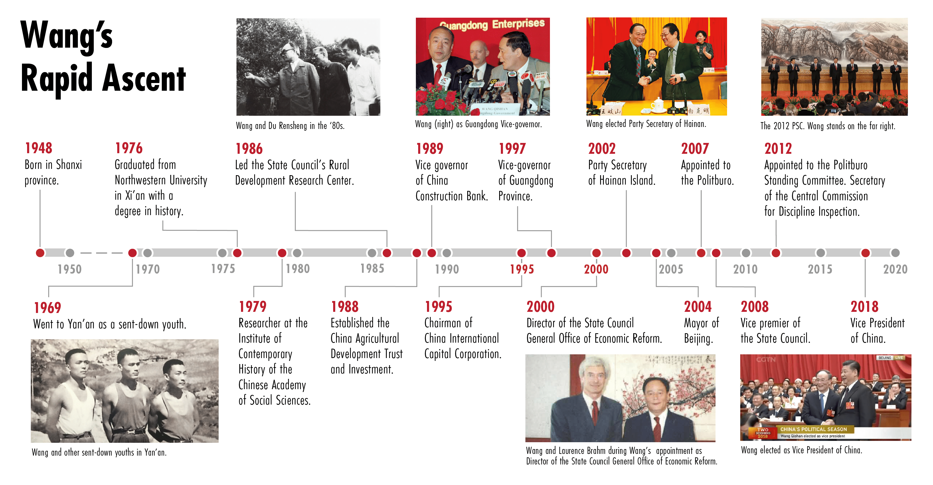 Wang is also known for his shrewd navigation of the Communist Party’s internal power struggles. Despite his association with Zhao Ziyang’s pro-reform faction, his career survived the fallout from the Tiananmen Massacre (and Zhao being put under house arrest), and in the 1990s, he managed to become one of premier Zhu Rongji’s top protégés. He later secured a place on the coveted Politburo Standing Committee at the 2012 Party Congress — during a period that was marked by extraordinary political infighting — and followed it up by assuming the most important role of his career: overseeing a sweeping anti-corruption drive, one of Xi Jinping’s top priorities.