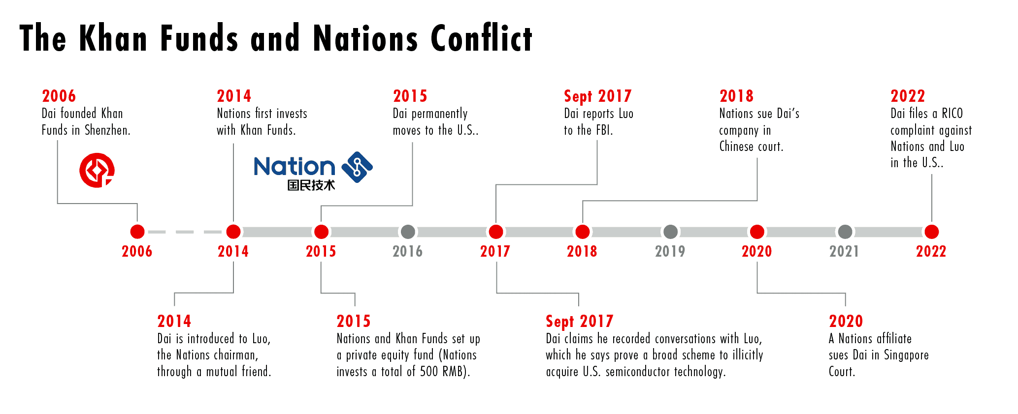 Dai’s all-encompassing fear stems from an ongoing dispute with a large Chinese semiconductor company called Nations Technologies. Nearly a decade ago, Nations agreed to invest with Dai’s firm, a successful Shenzhen-based healthcare hedge fund called Khan Funds, which had $1 billion in assets under management. In 2015, when Dai permanently moved to the U.S. on a business visa, the two companies agreed to expand their partnership. But the relationship went south, Dai says, when Luo Zhaoxue, the chairman of Nations, urged Dai to invest in U.S. semiconductor companies and revealed he was part of a larger, state-backed effort to acquire technology for China’s military.