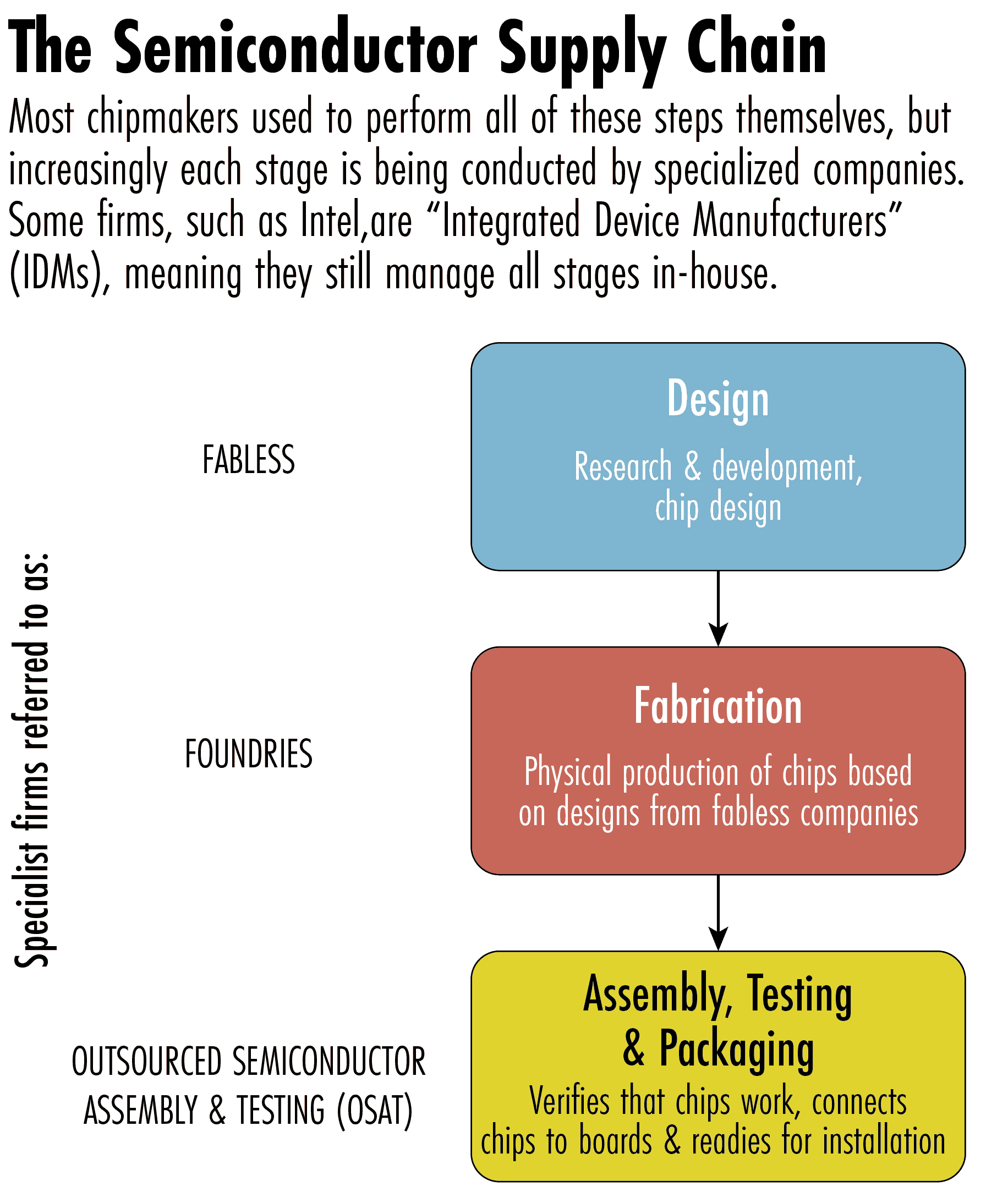 Foundries are semiconductor firms which serve as third party manufacturers, specializing in physical production in order to allow other chipmakers to concentrate on research and design, a model pioneered by Taiwan’s TSMC.