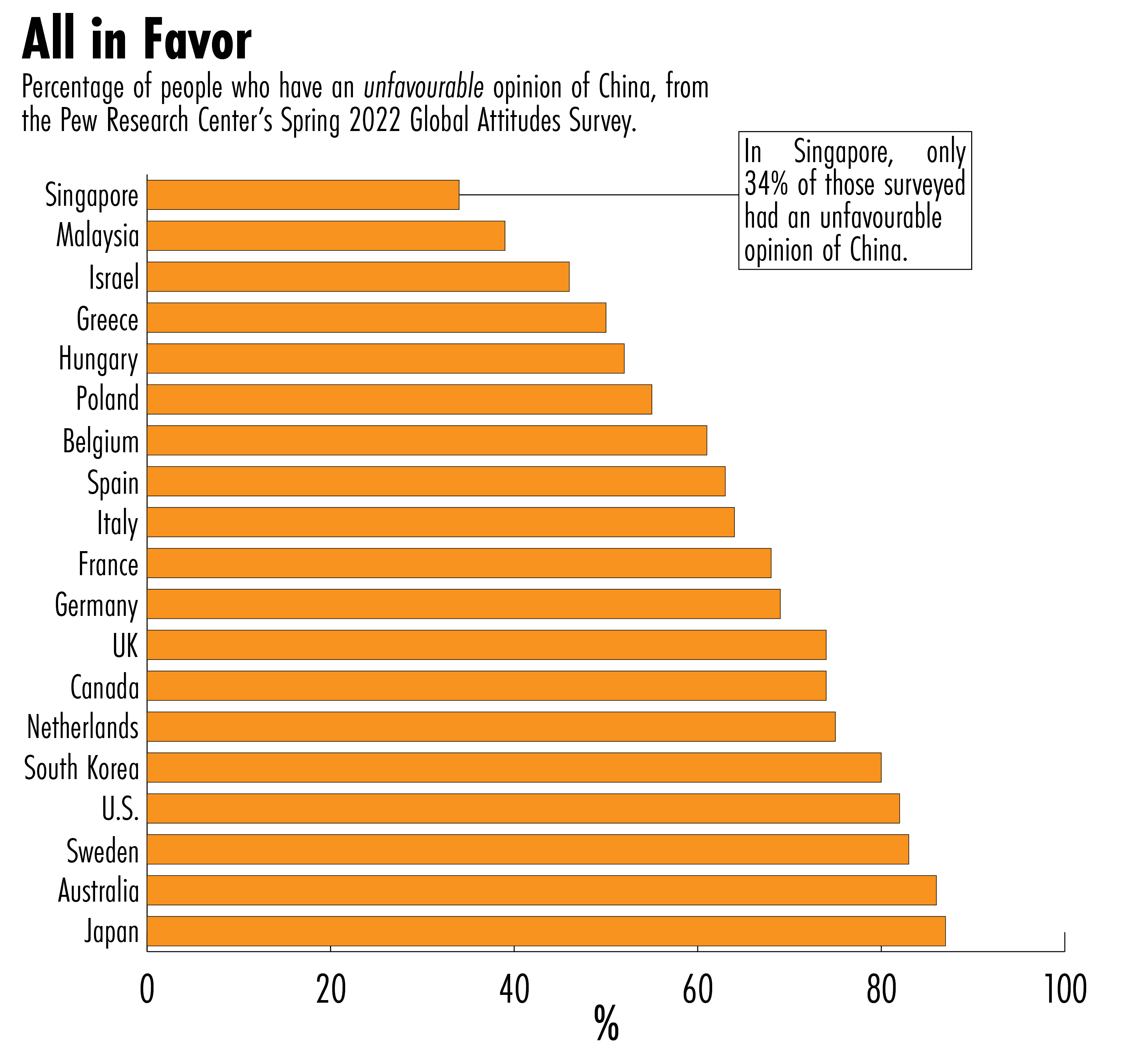It also helps that nearly three-quarters of Singapore’s 5.6 million citizens are ethnically Chinese and that 67 percent of Singaporeans view China favorably, according to a recent Pew survey.