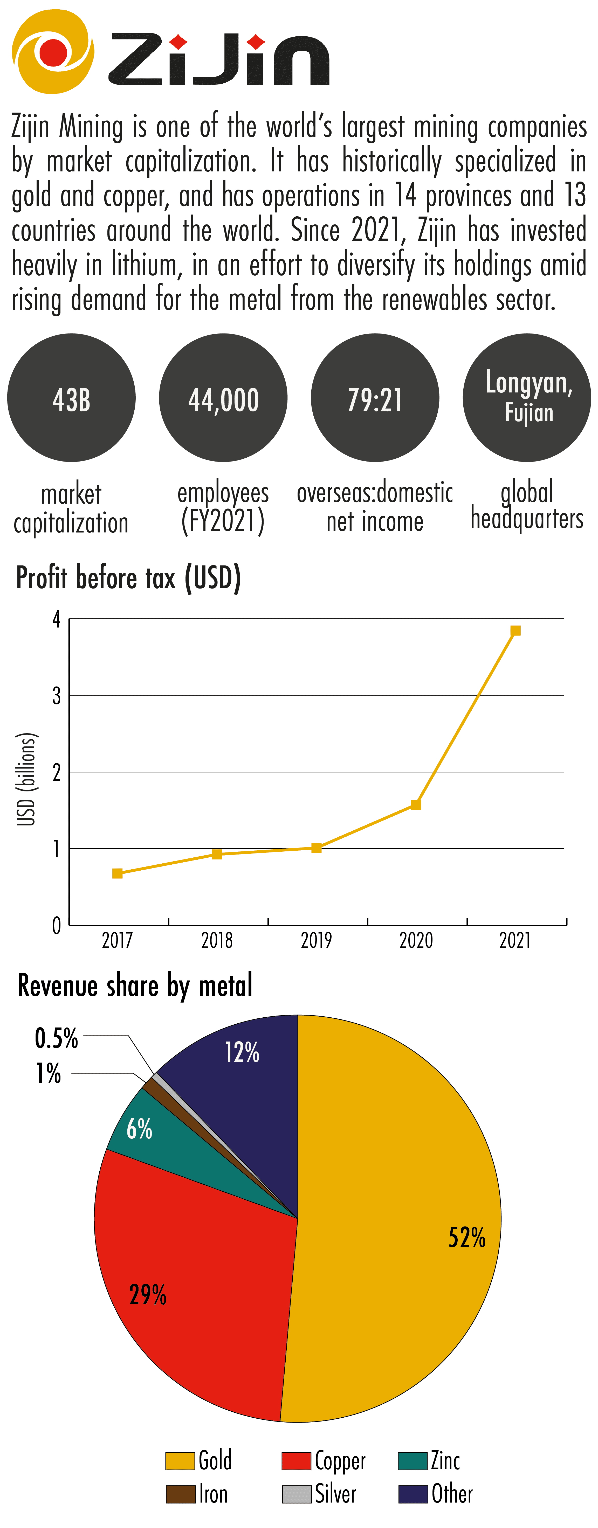 Gold and copper remain Zijin’s principal sources of revenue, with mined and refined products accounting for 52 and 29 percent of the company’s 2021 revenues, respectively. The company controls over three quarters of China’s copper reserves and over 40 percent of its gold.
