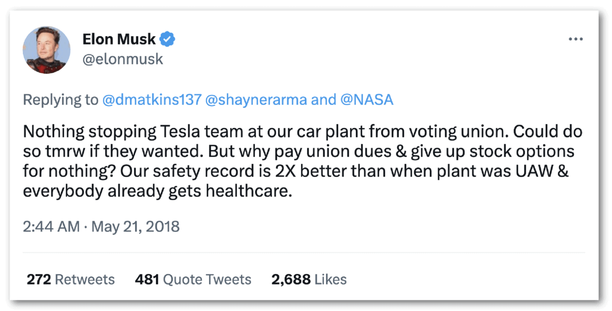Tesla and Musk have a history of being hostile to unionizing efforts, and they have drawn scrutiny from the U.S. government for it. In 2021, the NLRB ruled that Tesla could not prohibit its employees from speaking to the media about labor issues and that Musk had to delete an anti-union tweet.