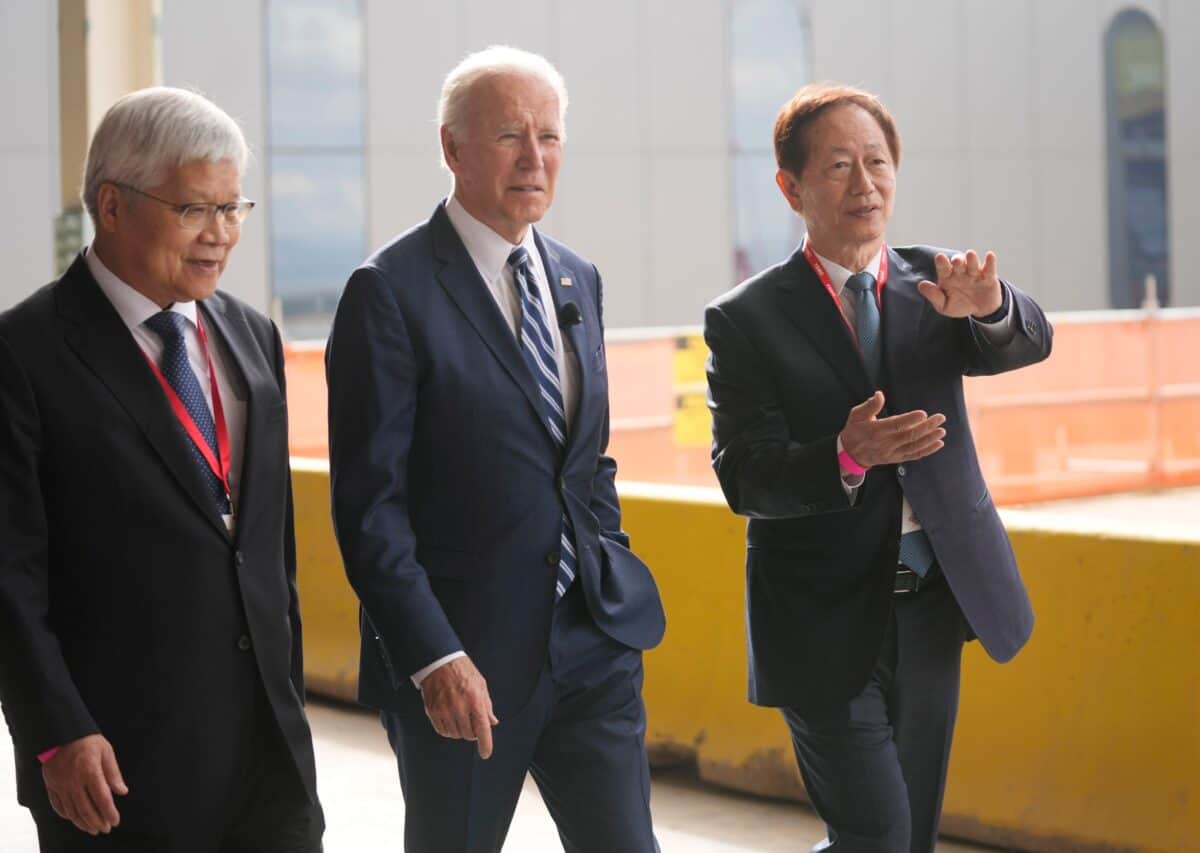 Joe Biden tours the Arizona factory with TSMC CEO C.C. Wei (left) and Chairman Mark Liu (right), December 6, 2022. On the right, a clean room under construction. Credit: Michael Chow via USA TODAY NETWORK