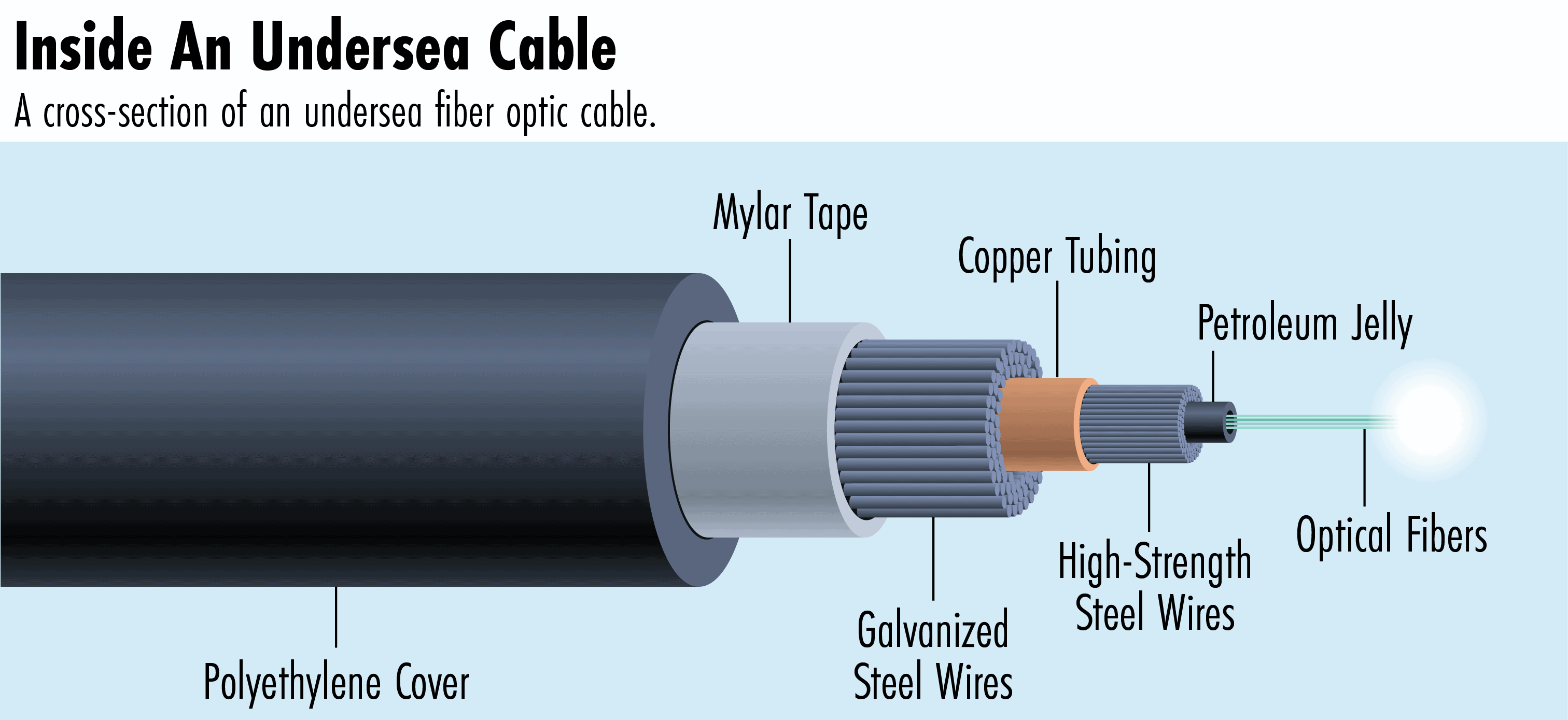The underwater fiber optic cables are wrapped in steel to fend off shark bites and other accidental damage. They are also often buried as much as three meters underground, if the seabed allows for it, and their locations are public knowledge — precisely to prevent shipping traffic inadvertently cutting connections.