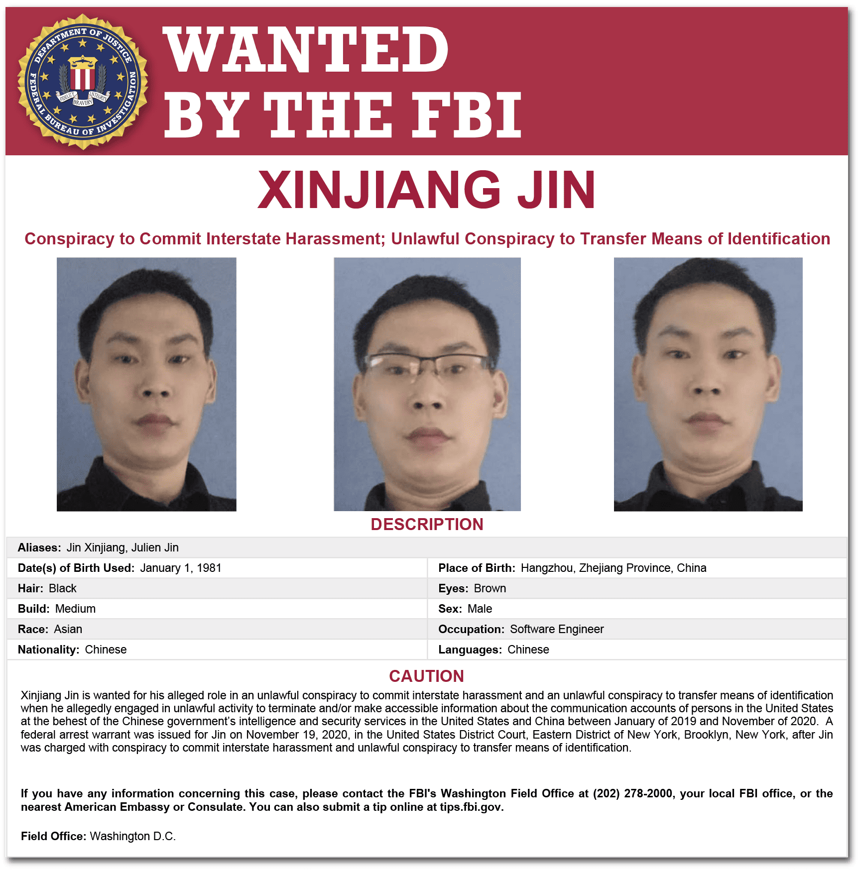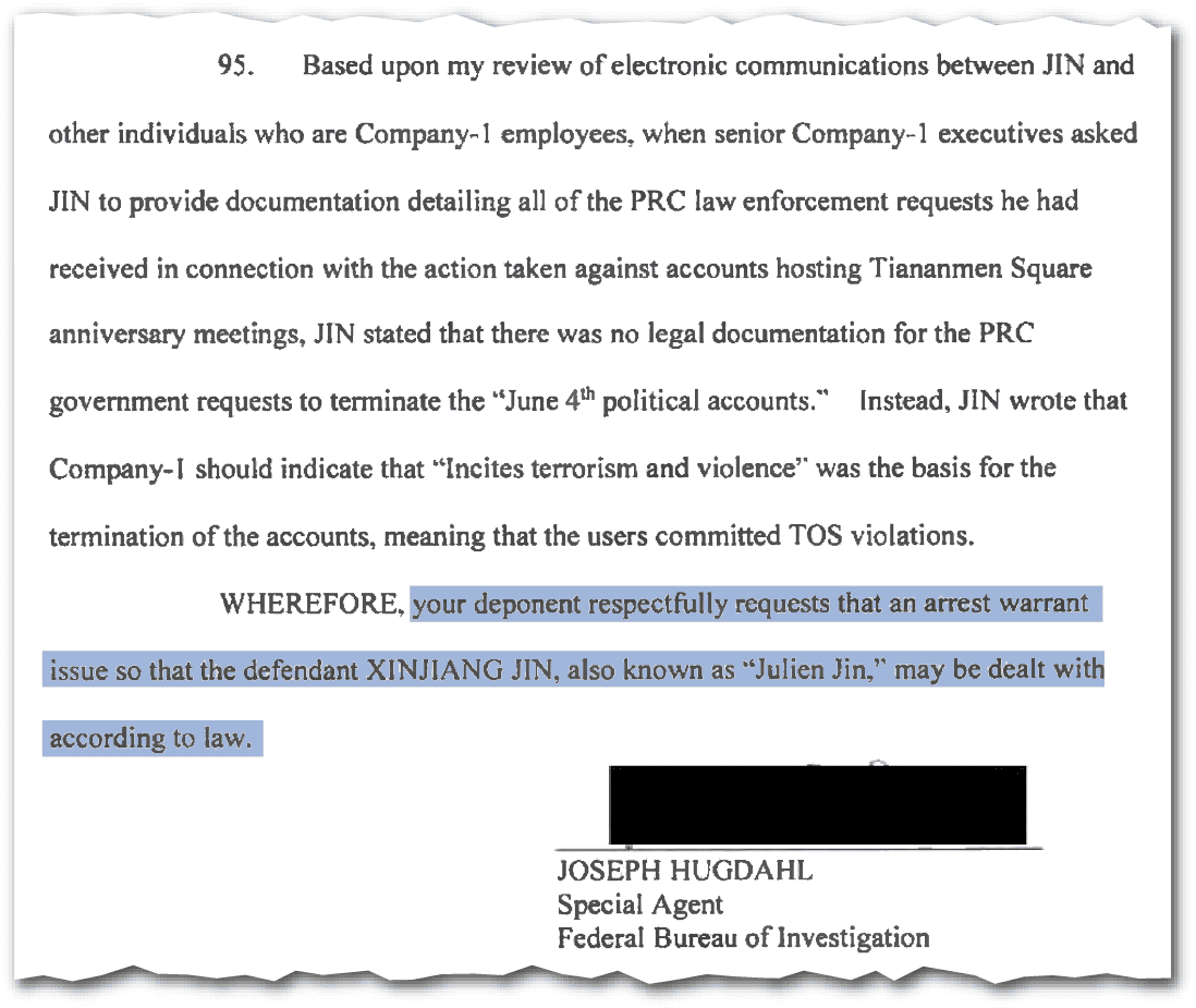 Jin’s official job responsibilities included liaising with China’s law enforcement and security services, including the Ministry of Public Security [MPS] and the Ministry of State Security [MSS], the political security and intelligence arm of the Chinese government. Jin’s role had been created in late 2019, after the Chinese government blocked Zoom’s access to the Chinese market. Access was restored only after the company agreed to proactively supervise and report “illegal” content within the Chinese market, granted Chinese security authorities special access to its China-based systems, and agreed to migrate the data of one million “Chinese users” from U.S. servers to servers in China.
