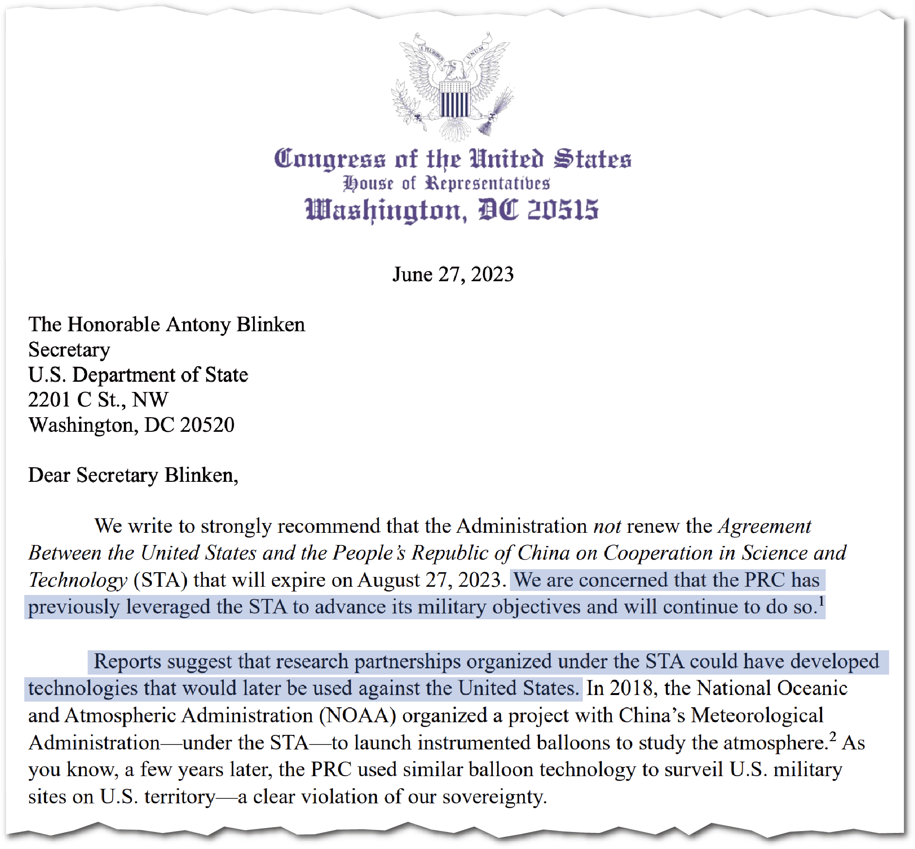 “The evidence available suggests that the PRC will continue to look for opportunities to exploit partnerships organized under the STA to advance its military objectives to the greatest extent possible and, in some cases, to attempt to undermine American sovereignty,” says the letter, which was signed by 10 representatives in total. “The United States must stop fueling its own destruction. Letting the STA expire is a good first step.”