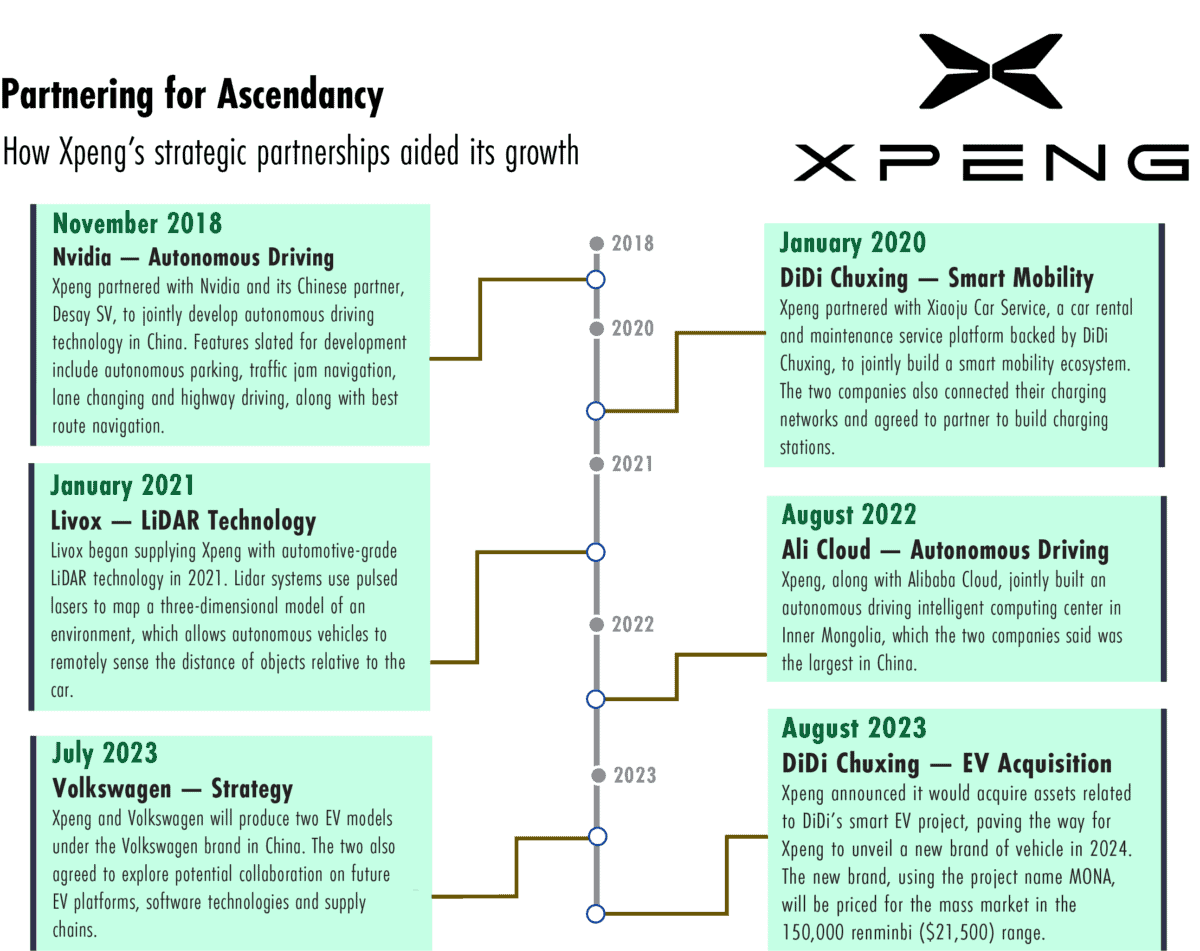 In July 2023, XPeng announced a strategic partnership with German automaker Volkswagen, in which the two companies agreed to jointly produce two EV models under the Volkswagen brand for sale in China. Volkswagen also gained a 5 percent stake in XPeng for $700 million.
