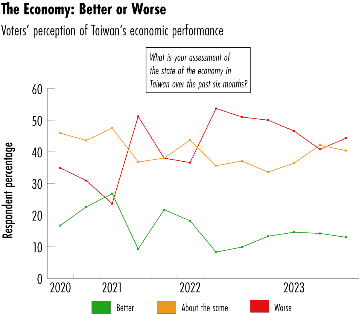 More than 70 percent of young people aged 20 to 35 voted in the 2020 presidential election, a significant increase from the 57 percent turnout in 2016. In November 2022, a constitutional referendum on lowering Taiwan’s voting age from 20 to 18 failed to pass, contributing to young people’s disappointment with the two major parties.
