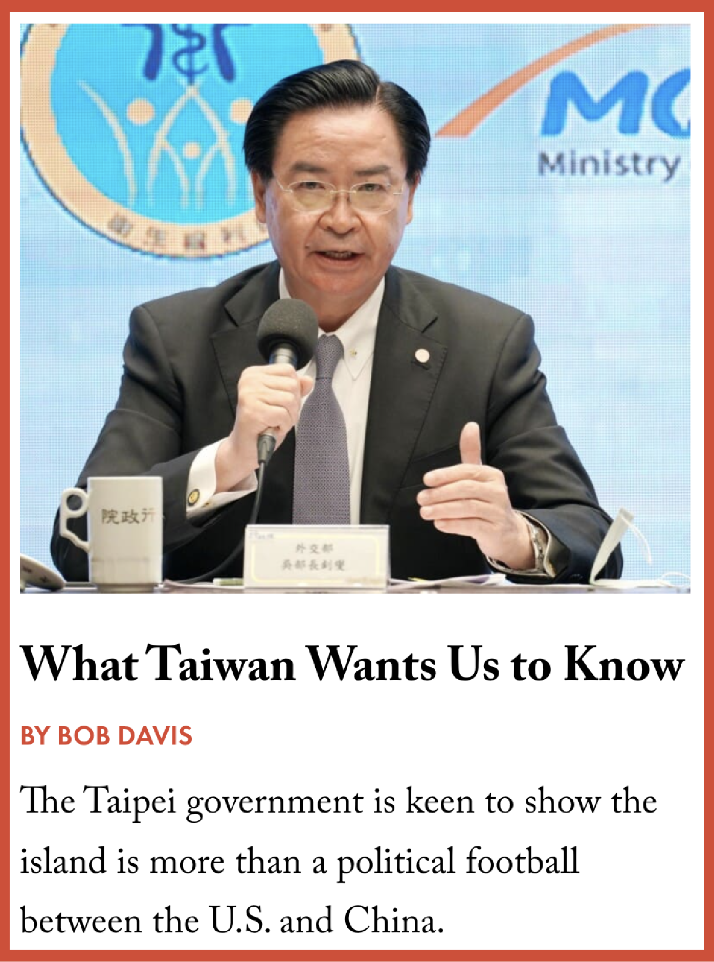 There’s a fear in Taiwan that Taiwan is going to be the perpetual orphan left alone to face this giant, authoritarian threat. That was missing from the movie, and Pottinger could speak to it. I kept arguing with him that I care about peace and diplomacy and asked why the U.S. is so terrible at coming up with diplomatic solutions that are current, that reflect reality, that deal with authoritarian countries and dictators. Pottinger firmly believes the best deterrent for Taiwan is to show that it will defend itself and the other countries in the region militarily — otherwise they’re going to get it, and it isn’t going to end with them.