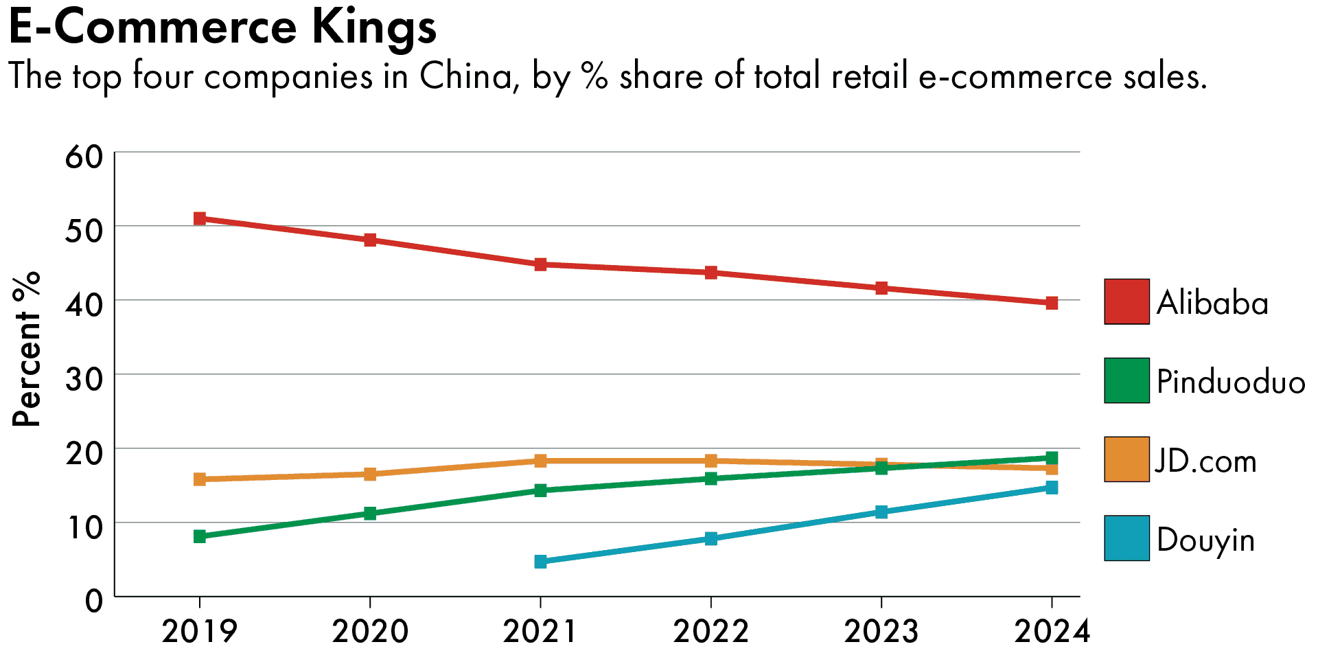 Instead of taking on Alibaba and JD.com directly, Pinduoduo turned to the untapped market of lower-tier cities and agricultural products. It pioneered a team-buying model, where users invite their friends and families to make purchases together and sellers lower prices in return for volume. When coupled with shifts in globalization and China’s larger economy, the strategy gave rise to a new era.