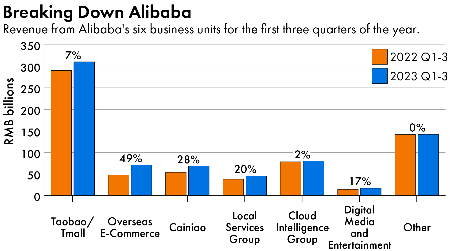 The group elevated its global e-commerce division to be its own independent unit, teeing the company up for an aggressive expansion outside China, where the slowing economy and intense competition have crimped Alibaba’s growth. Already, overseas e-commerce was Alibaba’s fastest growing segment in the first three quarters of 2023, with revenue up 49 percent year-on-year.