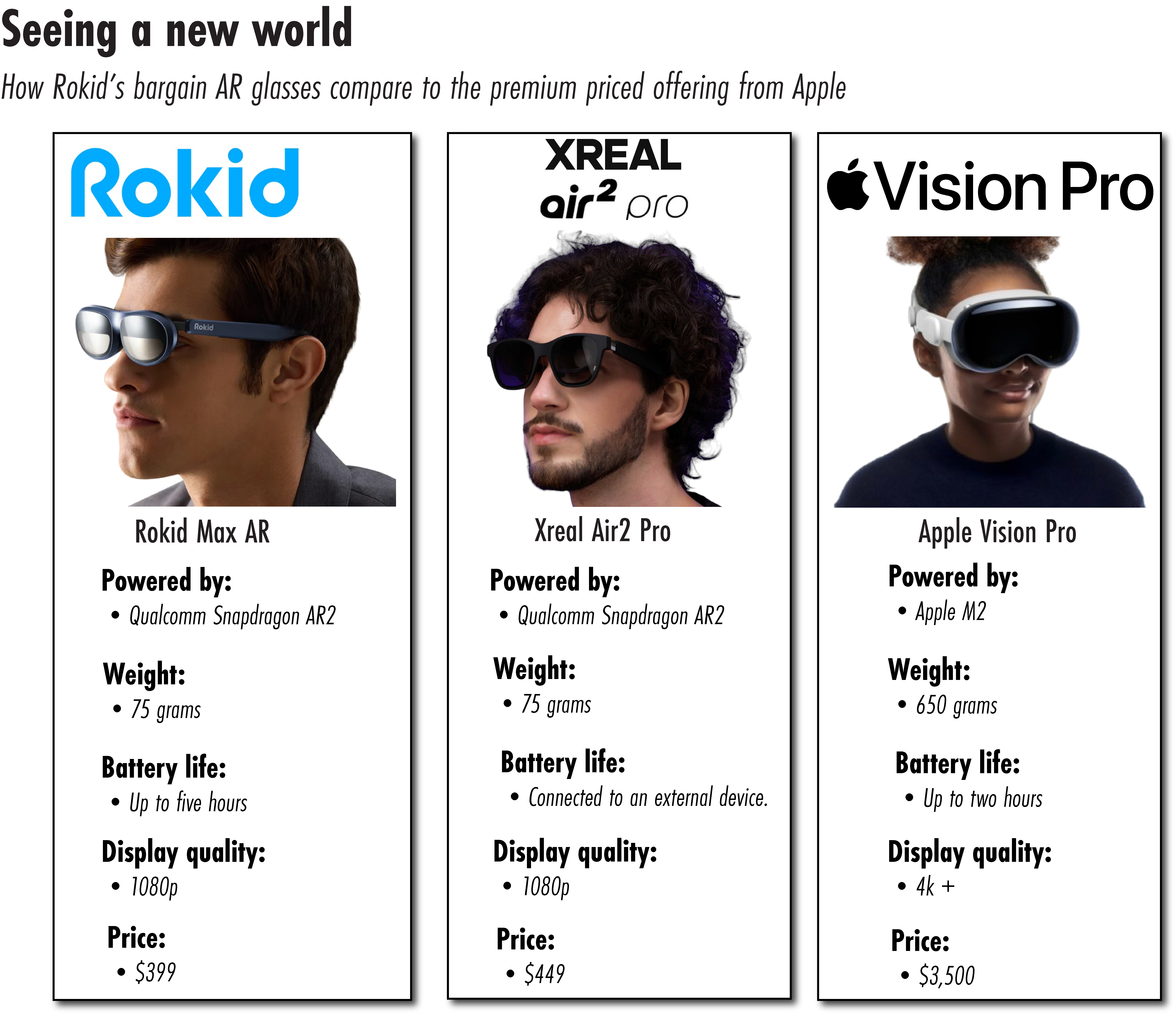 Check out the graphic below for a side-by-side comparison of the Apple Vision Pro with some of the leading AR glasses from Rokid and Xreal. While Apple aims for the Vision Pro’s functionality to rival that of your laptop or tablet, Rokid’s consumer products are primarily focused on gaming and watching movies, making the latter more lightweight and affordable.