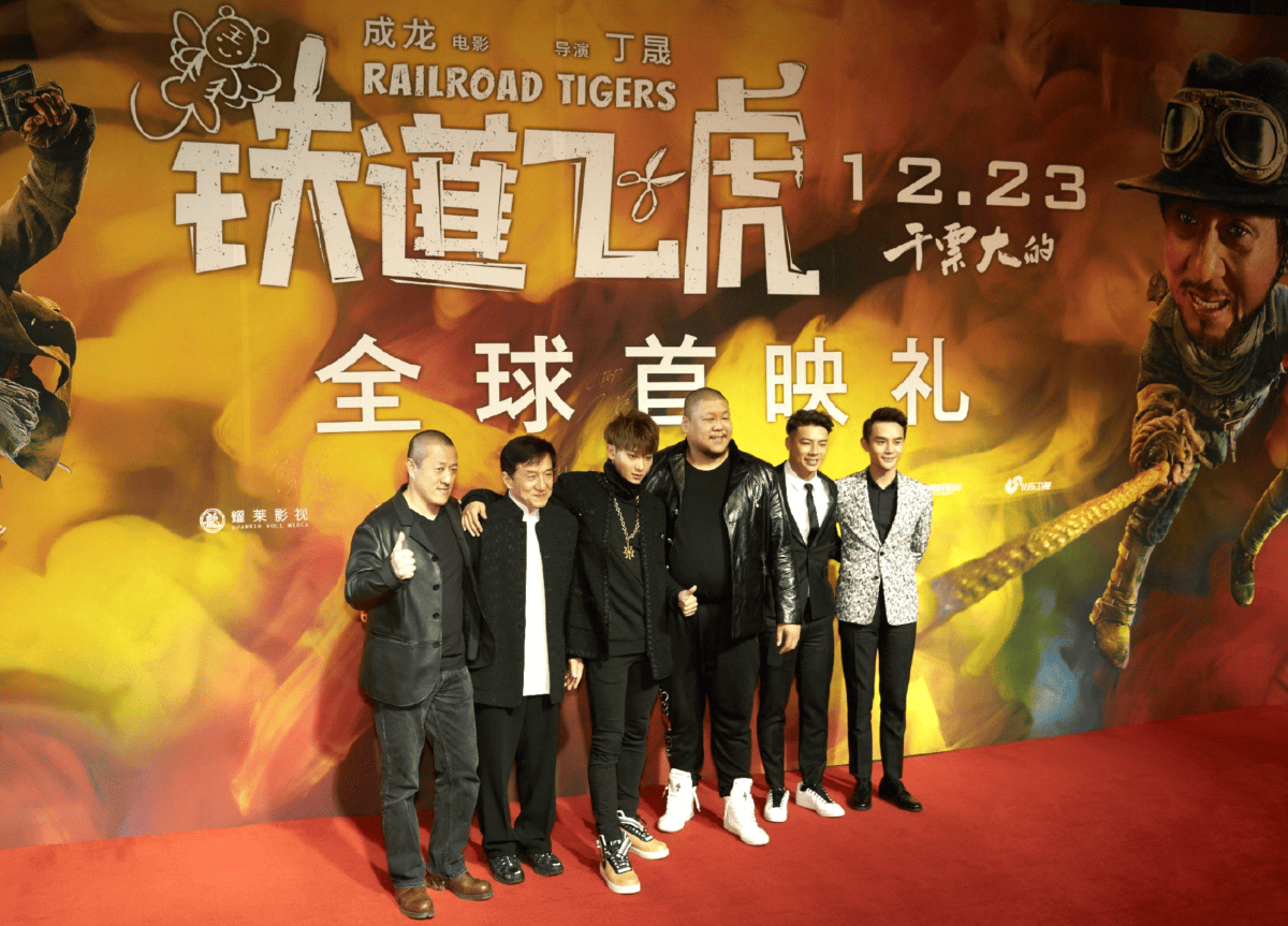 Left: Jackie Chan (second from left) and costars at a premiere for Railroad Tigers, a film released in 2016, which J.Q. Pictures Holdings had a hand in producing. Right: Qin Hong accepts awards during the 33rd China Film Golden Rooster Awards on behalf of director Peter Chan for his film Leap (夺冠), November 28, 2020.