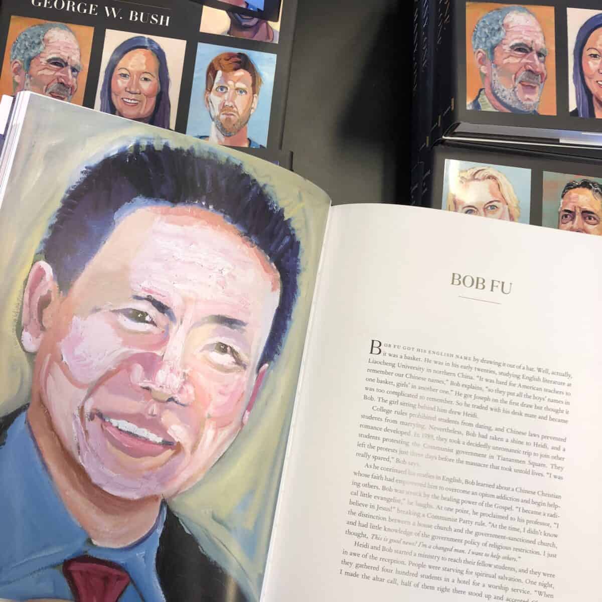 Left: Bob Fu presents then President George W. Bush and Mrs. Bush with hand-copied bible pages from Chinese Prisoners. November 1, 2011. Right: Bob Fu’s portrait and profile included in George W. Bush’s book, Out of Many, One. Credit: George W. Bush via Facebook, @BNMidland via X