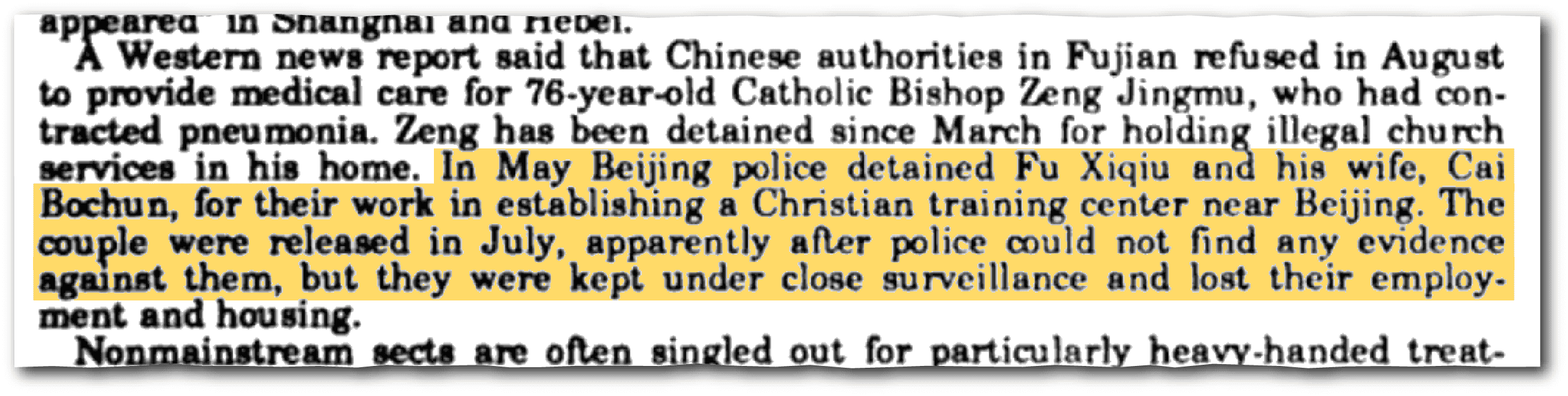 Fu turned to religion after an American English teacher at his college gave him a smuggled biography of Xi Shengmo, a 19th century Chinese convert to Christianity. Fu was hooked and converted himself after finishing the book. He then began to spread what he learned to other students and quietly organized small bible study groups on campus.